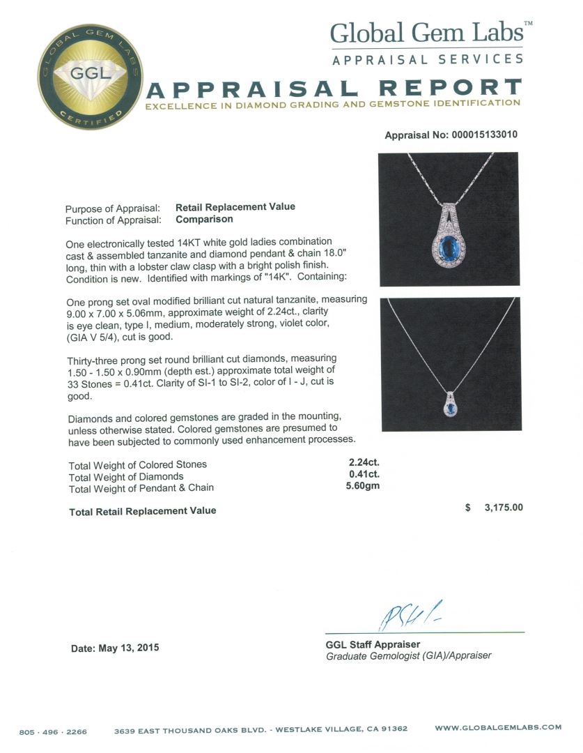 One electronically tested 14KT white gold ladies combination cast & assembled tanzanite and diamond pendant & chain 18.0" long, thin with a lobster claw clasp with a bright polish finish. Identified with markings of "14K". Condition is new. Containing: One prong set oval modified brilliant cut natural tanzanite, measuring 9.00 x 7.00 x 5.06mm, approximate weight of 2.24ct., clarity is eye clean, type I, medium, moderately strong, violet color, (GIA V 5/4), cut is good. Thirty-Three prong set round brilliant cut diamonds, measuring 1.50 - 1.50 x 0.90mm (depth est.) approximate total weight of 33 Stones = 0.41ct. Clarity: SI-1 to SI-2. Color: I - J, Cut is Good. Diamonds and colored gemstones are graded in the mounting, unless otherwise stated. Colored gemstones are presumed to have been subjected to commonly used enhancement processes. Total Weight of Colored Stones 2.24ct. Total Weight of Diamonds 0.41ct. Total Weight of Pendant & Chain 5.60 grams. GGL Appraised at $3,175.00.