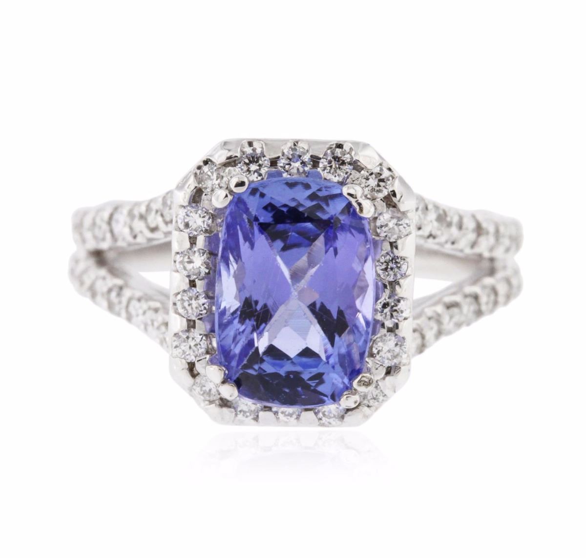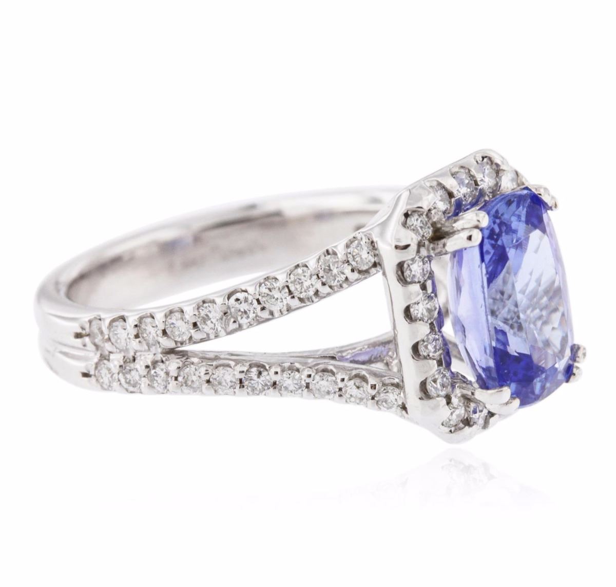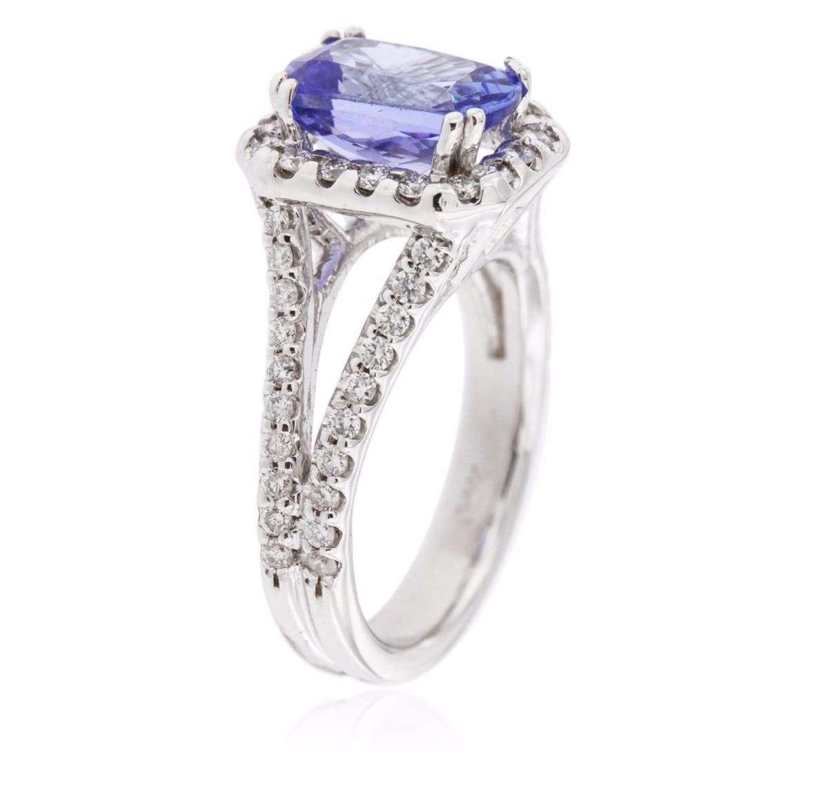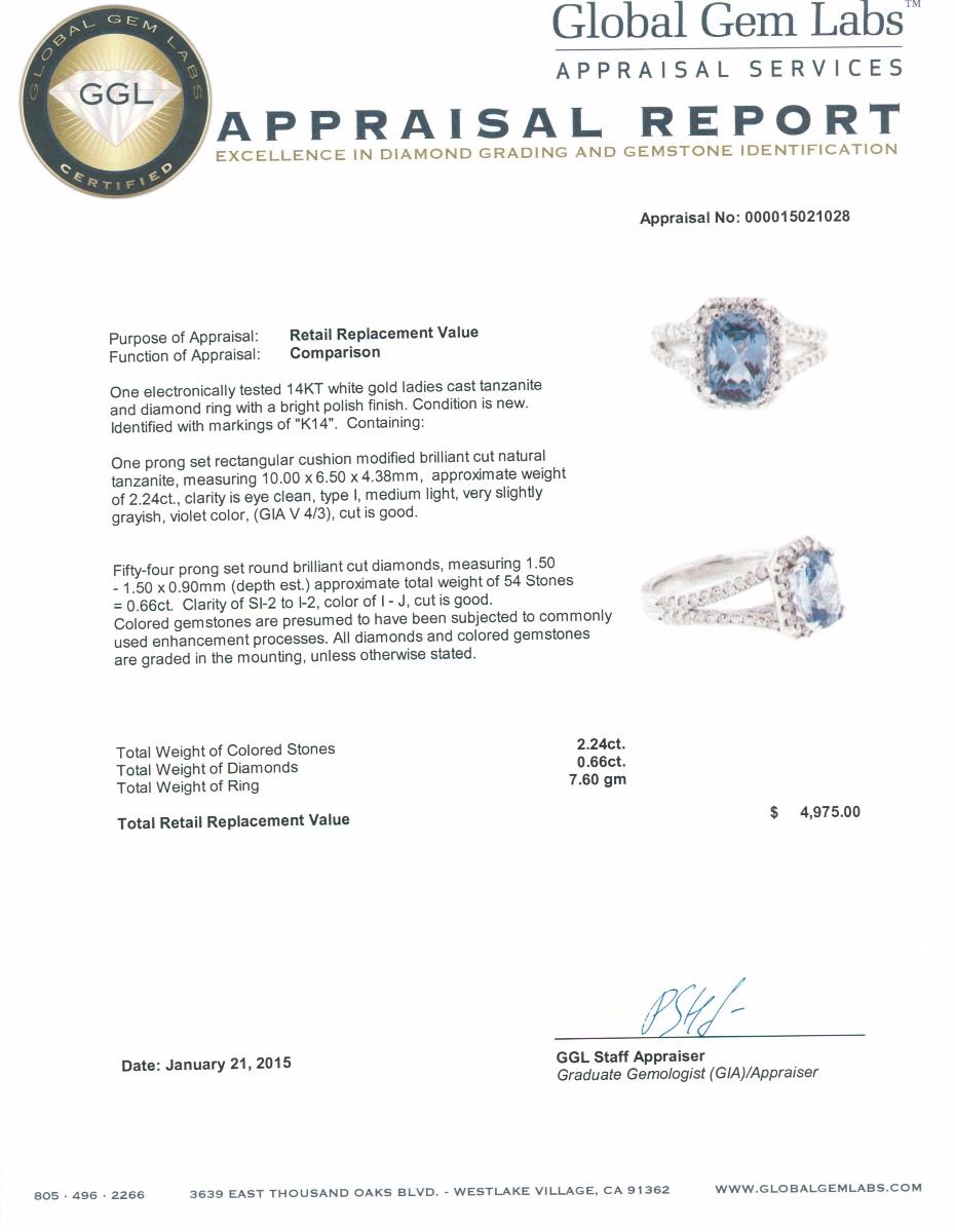 One electronically tested 14KT white gold ladies cast tanzanite and diamond ring with a bright polish finish. Identified with markings of "K14". Condition is new. Containing: One prong set rectangular cushion modified brilliant cut natural tanzanite, measuring 10.00 x 6.50 x 4.38mm, approximate weight of 2.24ct., clarity is eye clean, type I, medium light, very slightly grayish, violet color, (GIA V 4/3), cut is good. Fifty-Four prong set round brilliant cut diamonds, measuring 1.50 - 1.50 x 0.90mm (depth est.) approximate total weight of 54 Stones = 0.66ct. Clarity: SI-2 to I-2. Color: I - J, Cut is Good. Colored gemstones are presumed to have been subjected to commonly used enhancement processes. All diamonds and colored gemstones are graded in the mounting, unless otherwise stated. Total Weight of Colored Stones 2.24ct. Total Weight of Diamonds 0.66ct. Total Weight of Ring 7.60 grams. GGL Appraised at $4,975.00.