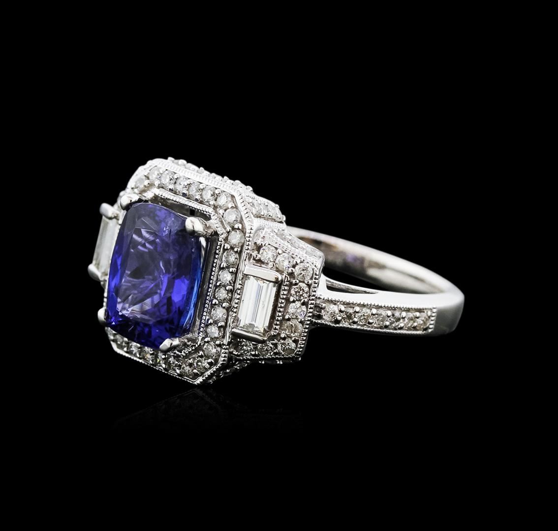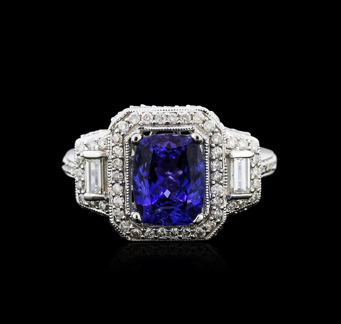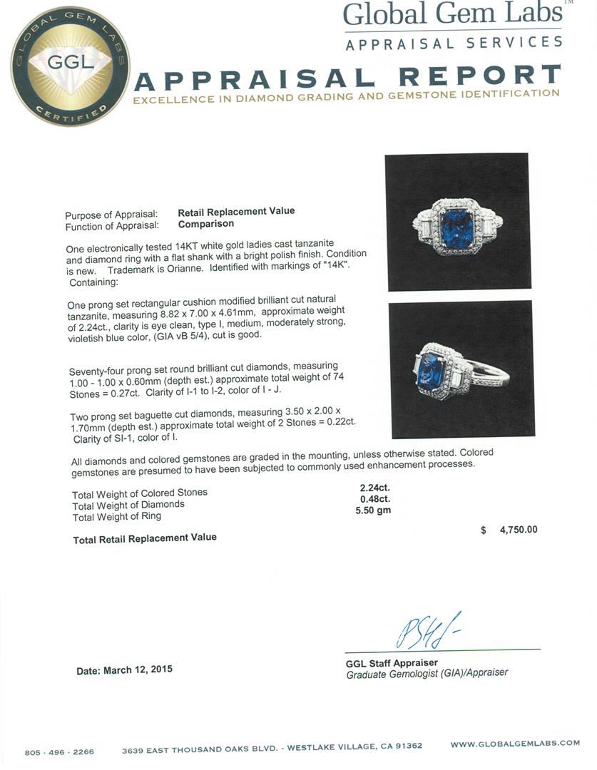 One electronically tested 14KT white gold ladies cast tanzanite and diamond ring with a flat shank with a bright polish finish. Trademark is Orianne. Identified with markings of "14K". Condition is new. Containing: One prong set rectangular cushion modified brilliant cut natural tanzanite, measuring 8.82 x 7.00 x 4.61mm, approximate weight of 2.24ct., clarity is eye clean, type I, medium, moderately strong, violetish blue color, (GIA vB 5/4), cut is good. Seventy-Four prong set round brilliant cut diamonds, measuring 1.00 - 1.00 x 0.60mm (depth est.) approximate total weight of 74 Stones = 0.27ct. Clarity: I-1 to I-2. Color: I - J. Two prong set baguette cut diamonds, measuring 3.50 x 2.00 x 1.70mm (depth est.) approximate total weight of 2 Stones = 0.22ct. Clarity: SI-1. Color: I. All diamonds and colored gemstones are graded in the mounting, unless otherwise stated. Colored gemstones are presumed to have been subjected to commonly used enhancement processes.. Total Weight of Colored Stones 2.24ct. Total Weight of Diamonds 0.48ct. Total Weight of Ring 5.50 grams. GGL Appraised at $4,750.00.