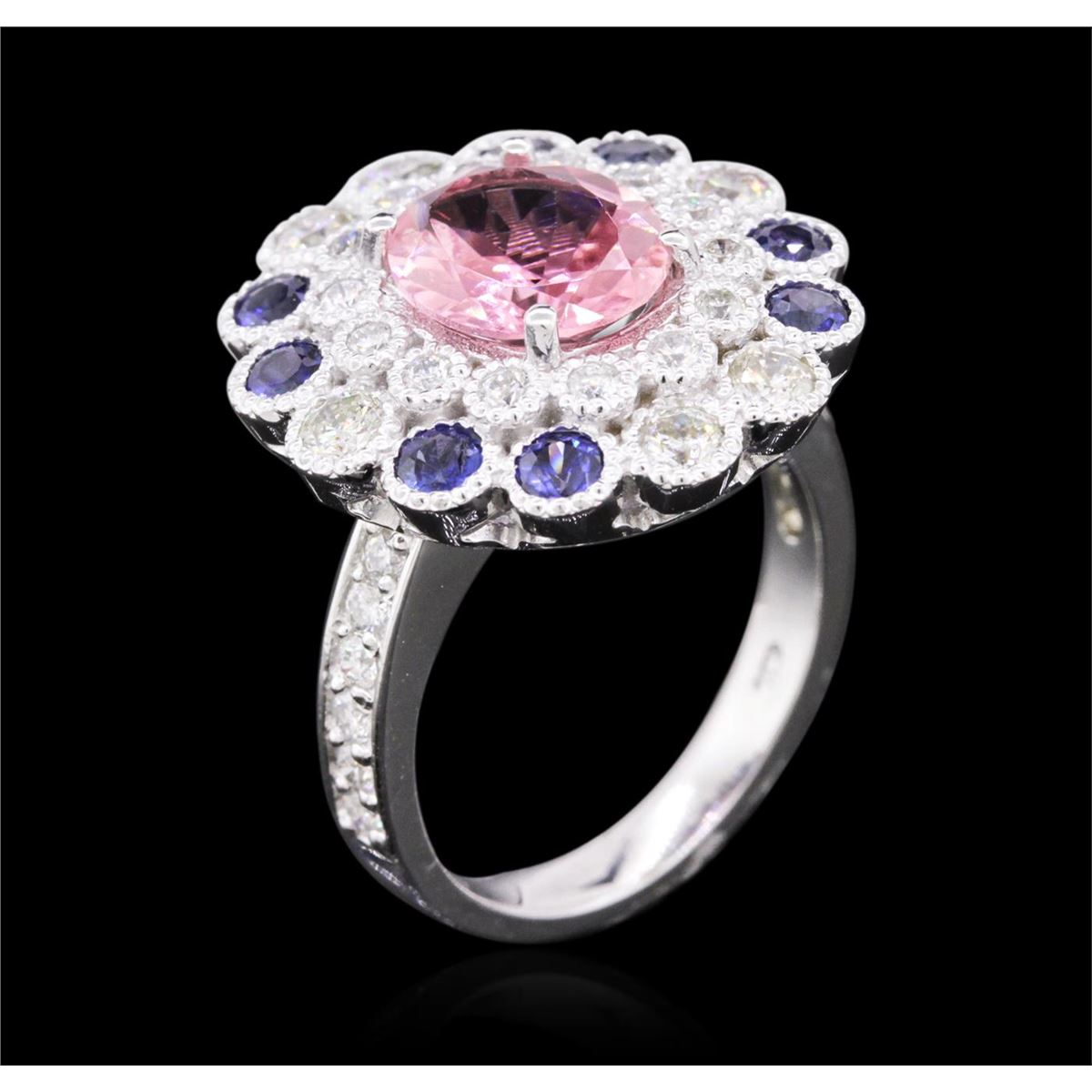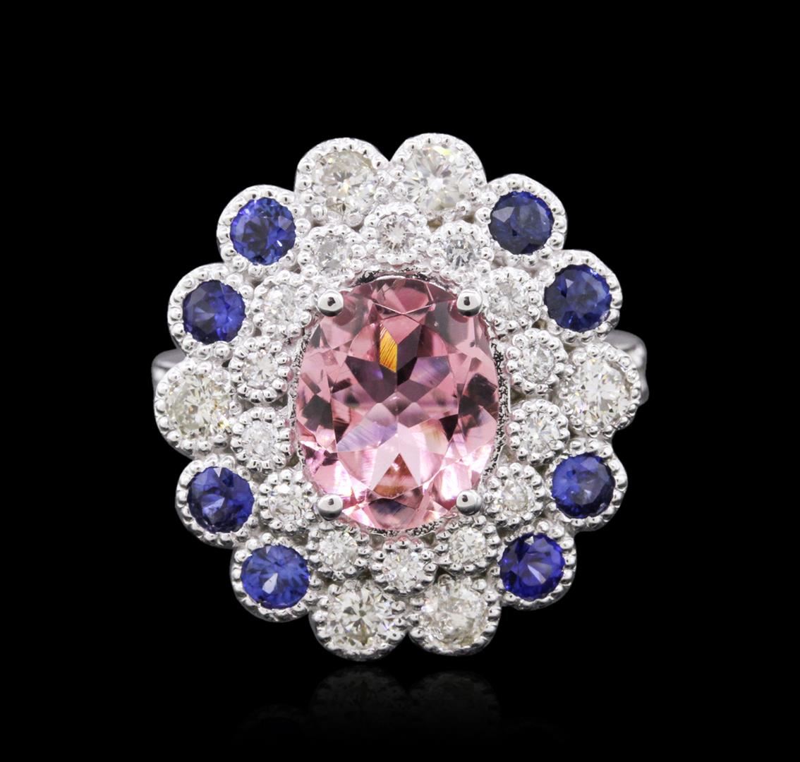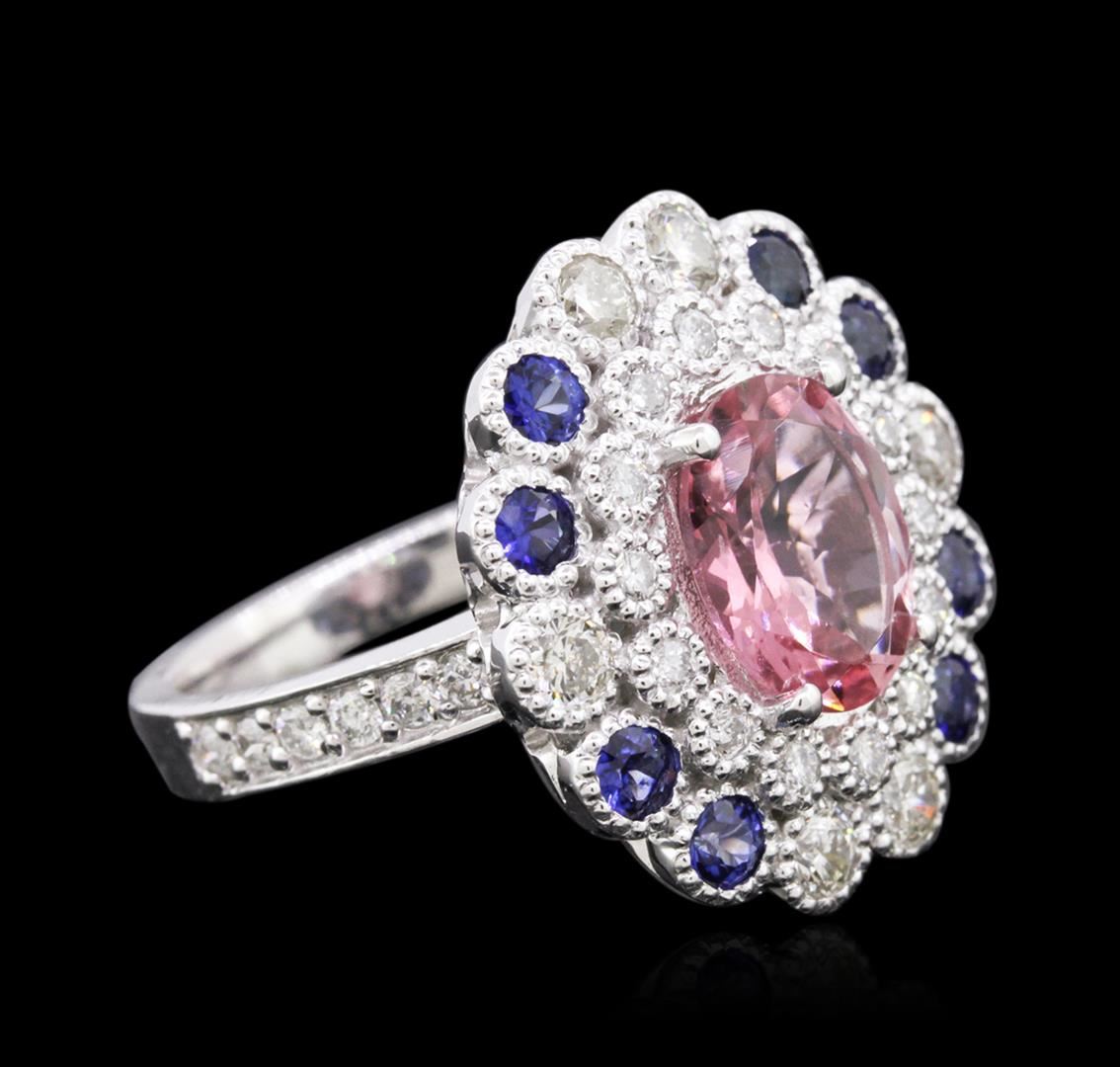 One electronically tested 14KT white gold ladies cast tourmaline, sapphire & diamond ring with a bright polish finish. Identified with markings of "K14". Condition is new. Containing: One prong set oval modified brilliant cut natural pink tourmaline, measuring 10.05 x 8.12 x 4.28mm, approximate weight of 2.24ct., clarity is eye clean, type II, light, slightly grayish, reddish purple color, (GIA rP 3/2), cut is good. Two prong set round modified brilliant cut natural blue sapphires, measuring 2.50 - 2.50 x 1.63 mm, approximate total weight of 0.16ct., clarity is eye clean, type II, medium, moderately strong, blue color, (GIA B 5/4), cut is good. Six gypsy set round brilliant cut diamonds, measuring 2.50 - 2.50 x 1.50mm (depth est.) approximate total weight of 6 Stones = 0.34ct. Clarity: SI-1. Color: J - K, Cut is Good. Fourteen gypsy set round brilliant cut diamonds, measuring 1.50 - 1.50 x 0.90mm (depth est.) approximate total weight of 14 Stones = 0.17ct. Clarity: SI-1. Color: J - K, Cut is Good. Colored gemstones are presumed to have been subjected to commonly used enhancement processes. All diamonds and colored gemstones are graded in the mounting, unless otherwise stated. Total Weight of Colored Stones 2.40ct. Total Weight of Diamonds 0.52ct. Total Weight of Ring 8.80 grams. GGL Appraised at $4,885.00.