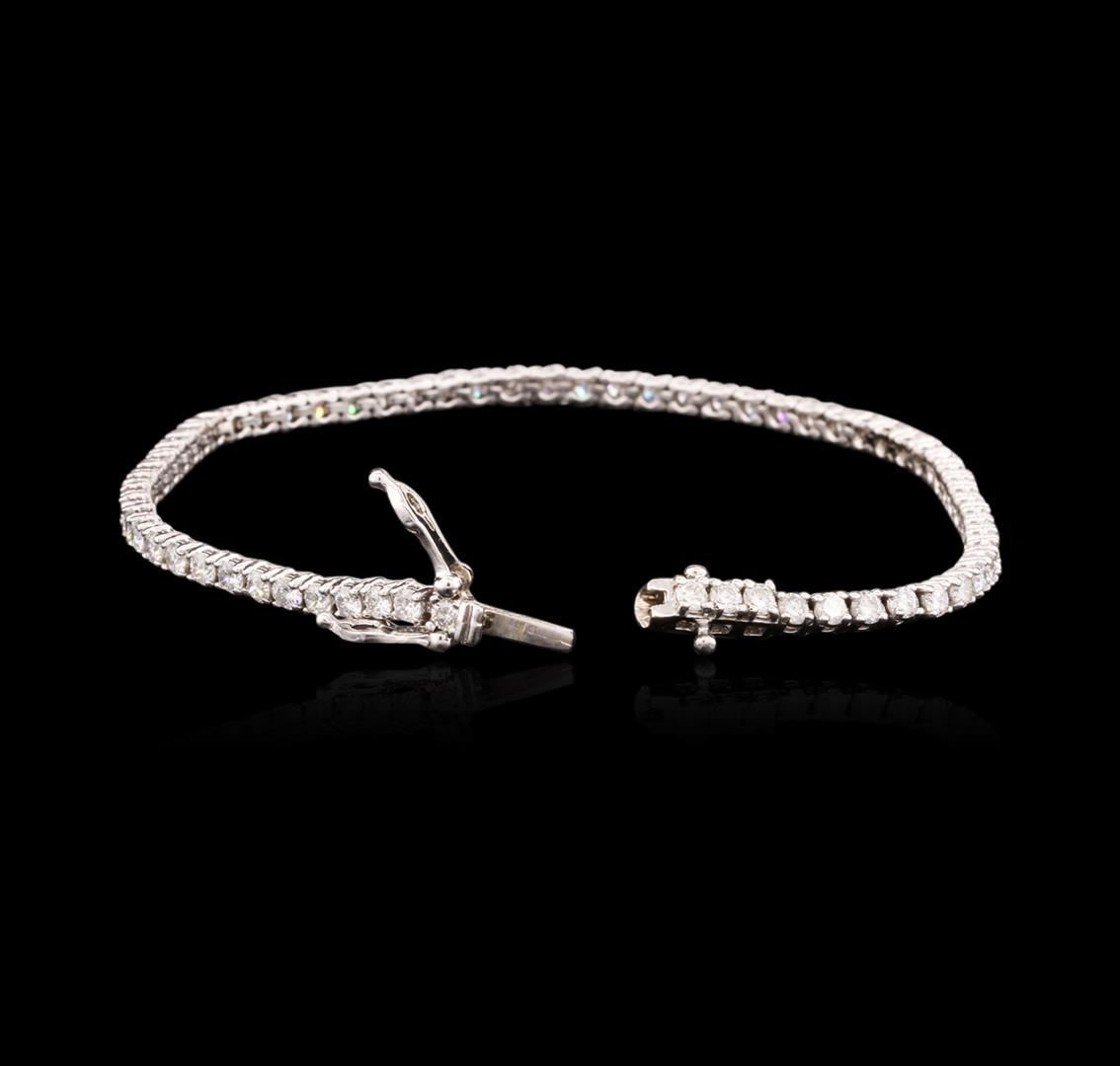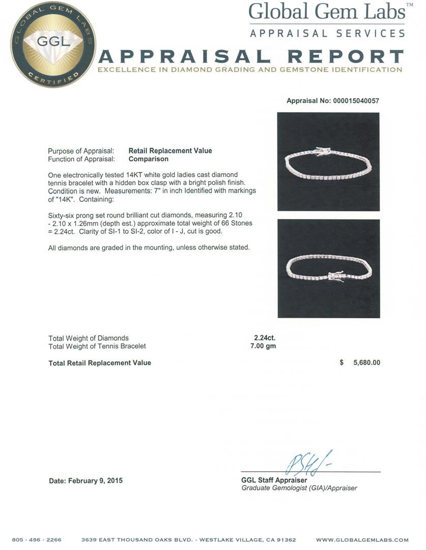 One electronically tested 14KT white gold ladies cast diamond tennis bracelet with a hidden box clasp with a bright polish finish. Measurements: 7" in inch Identified with markings of "14K". Condition is new. Containing: Sixty-Six prong set round brilliant cut diamonds, measuring 2.10 - 2.10 x 1.26mm (depth est.) approximate total weight of 66 Stones = 2.24ct. Clarity: SI-1 to SI-2. Color: I - J, Cut is Good. All diamonds are graded in the mounting, unless otherwise stated. Total Weight of Diamonds 2.24ct. Total Weight of Tennis Bracelet 7.00 grams. GGL Appraised at $5,680.00.