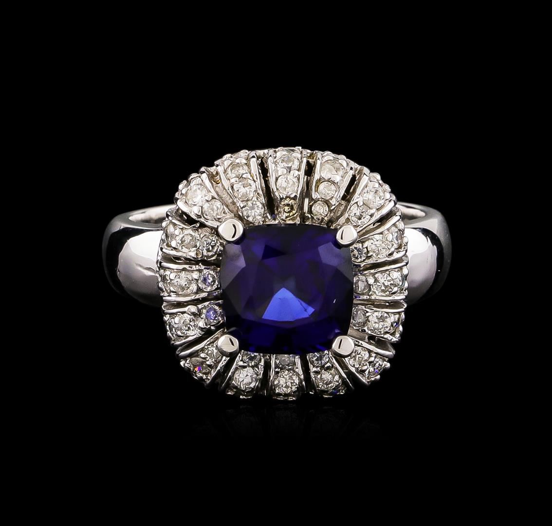 One electronically tested 14KT white gold ladies combination cast & assembled ring with a bright polish finish. Condition is new. Identified with markings of "14K". Containing: Sixty-Four prong set round brilliant cut diamonds, measuring 1.30 - 1.30 x 0.78mm (depth est.) approximate. Total Weight of 64 Stones = 0.51ct. Clarity: I-1 to I-2. Color: H - I, Cut is Good. One prong set square cushion modified brilliant cut natural tanzanite, measuring 7.60 x 7.60 x 4.94mm, approximate weight of 2.25ct., clarity is eye clean, type I, medium, moderately strong, blue color, (GIA B 5/4), cut is good. Colored gemstones are presumed to have been subjected to commonly used enhancement processes. All diamonds and colored gemstones are graded in the mounting, unless otherwise stated. Total Weight of Colored Stones 2.25ct. Total Weight of Diamonds 0.51ct. Total Weight of Ring 6.80 grams. GGL Appraised at $6,970.00.