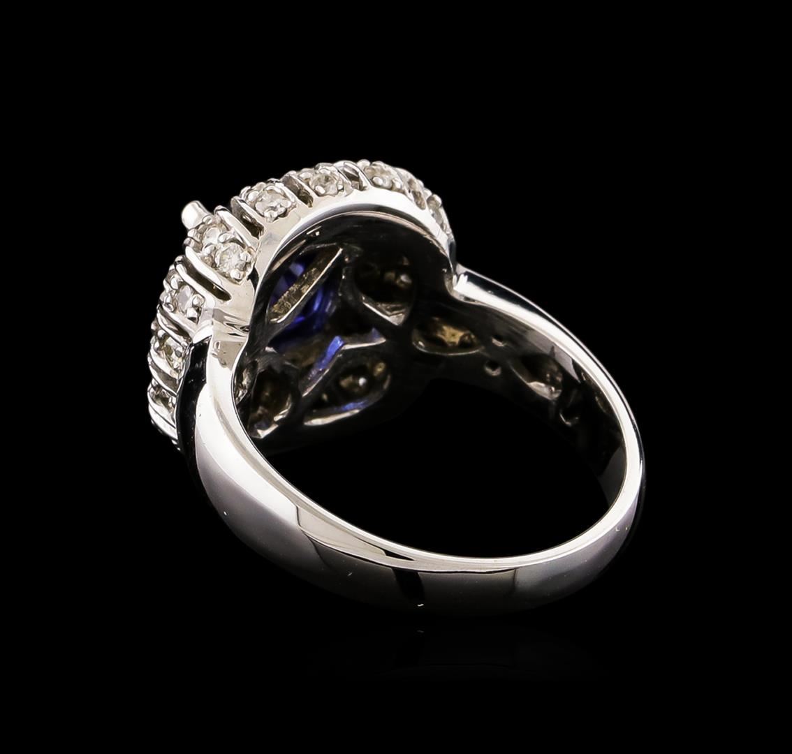 One electronically tested 14KT white gold ladies combination cast & assembled ring with a bright polish finish. Condition is new. Identified with markings of "14K". Containing: Sixty-Four prong set round brilliant cut diamonds, measuring 1.30 - 1.30 x 0.78mm (depth est.) approximate. Total Weight of 64 Stones = 0.51ct. Clarity: I-1 to I-2. Color: H - I, Cut is Good. One prong set square cushion modified brilliant cut natural tanzanite, measuring 7.60 x 7.60 x 4.94mm, approximate weight of 2.25ct., clarity is eye clean, type I, medium, moderately strong, blue color, (GIA B 5/4), cut is good. Colored gemstones are presumed to have been subjected to commonly used enhancement processes. All diamonds and colored gemstones are graded in the mounting, unless otherwise stated. Total Weight of Colored Stones 2.25ct. Total Weight of Diamonds 0.51ct. Total Weight of Ring 6.80 grams. GGL Appraised.