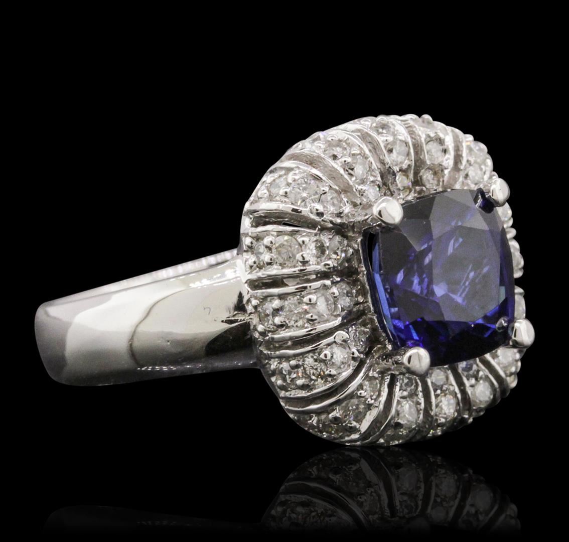 One electronically tested 14KT white gold ladies combination cast & assembled ring with a bright polish finish. Condition is new. Identified with markings of "14K". Containing: Sixty-Four prong set round brilliant cut diamonds, measuring 1.30 - 1.30 x 0.78mm (depth est.) approximate. Total Weight of 64 Stones = 0.51ct. Clarity: I-1 to I-2. Color: H - I, Cut is Good. One prong set square cushion modified brilliant cut natural tanzanite, measuring 7.60 x 7.60 x 4.94mm, approximate weight of 2.25ct., clarity is eye clean, type I, medium, moderately strong, blue color, (GIA B 5/4), cut is good. Colored gemstones are presumed to have been subjected to commonly used enhancement processes. All diamonds and colored gemstones are graded in the mounting, unless otherwise stated. Total Weight of Colored Stones 2.25ct. Total Weight of Diamonds 0.51ct. Total Weight of Ring 6.80 grams. GGL Appraised at $6,970.00.
