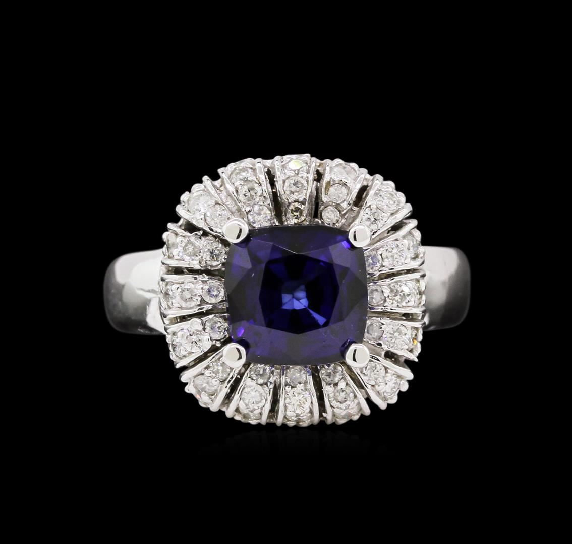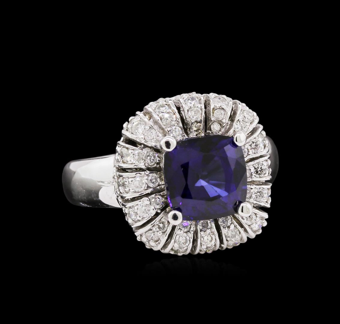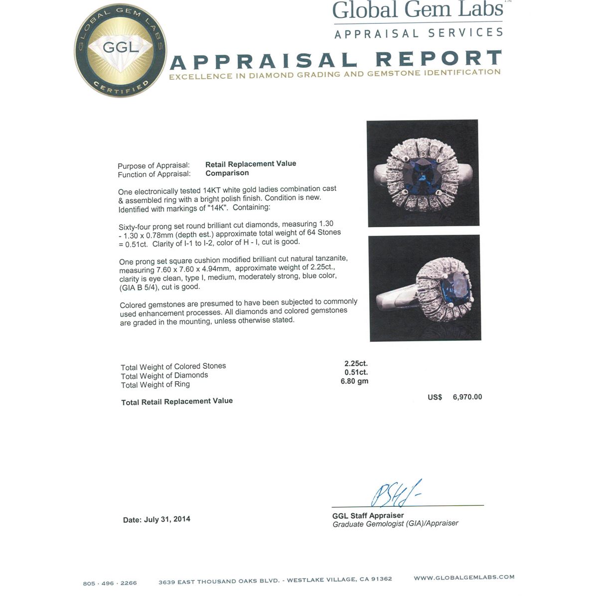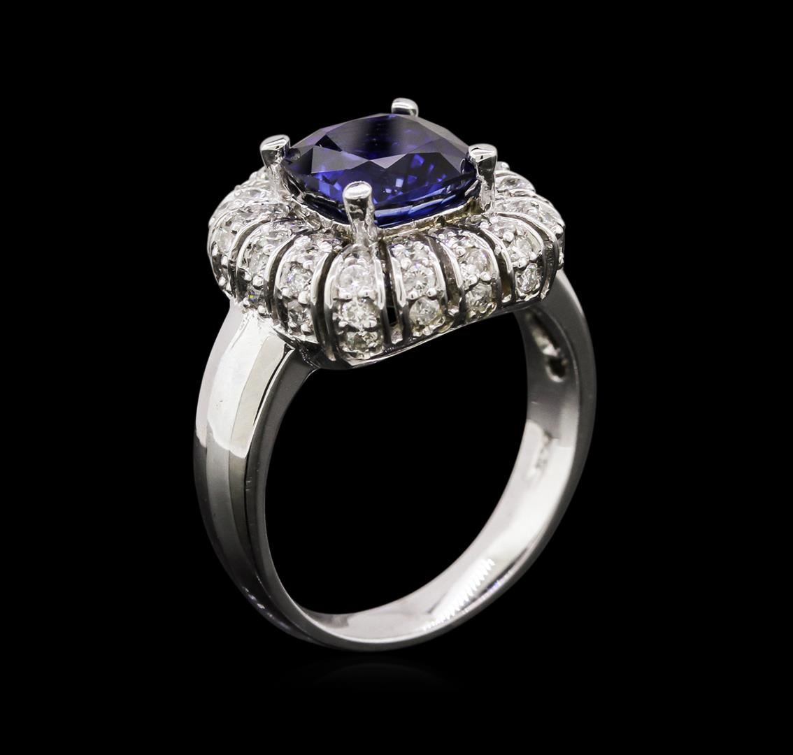 One electronically tested 14KT white gold ladies combination cast & assembled ring with a bright polish finish. Condition is new. Identified with markings of "14K". Containing: Sixty-Four prong set round brilliant cut diamonds, measuring 1.30 - 1.30 x 0.78mm (depth est.) approximate. Total Weight of 64 Stones = 0.51ct. Clarity: I-1 to I-2. Color: H - I, Cut is Good. One prong set square cushion modified brilliant cut natural tanzanite, measuring 7.60 x 7.60 x 4.94mm, approximate weight of 2.25ct., clarity is eye clean, type I, medium, moderately strong, blue color, (GIA B 5/4), cut is good. Colored gemstones are presumed to have been subjected to commonly used enhancement processes. All diamonds and colored gemstones are graded in the mounting, unless otherwise stated. Total Weight of Colored Stones 2.25ct. Total Weight of Diamonds 0.51ct. Total Weight of Ring 6.80 grams. GGL Appraised at $6,970.00.