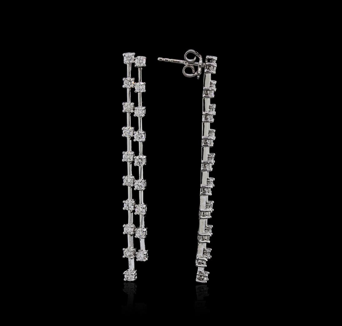 One pair electronically tested 14KT white gold ladies cast diamond earrings with friction posts with a bright polish finish. Identified with markings of "585". Condition is new. Containing: Thirty-Eight prong set round brilliant cut diamonds, measuring 2.40 - 2.40 x 1.44mm (depth est.) approximate total weight of 38 Stones = 2.25ct. Clarity: SI-1 to I-1. Color: I - J, Cut is Good. All diamonds are graded in the mounting, unless otherwise stated. Total Weight of Diamonds 2.25ct. Total Weight of Earrings 7.00 grams. GGL Appraised at $4,860.00.