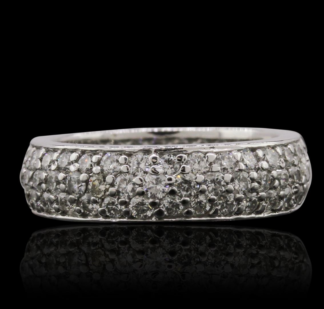 One electronically tested 14KT white gold ladies cast diamond eternity ring with a bright polish finish. Condition is new, good workmanship. The ring features a continuous four and one-half millimeter wide pave, set diamond ribbon. Containing: Ninety-Three pave, set round brilliant cut diamonds, measuring 1.90 - 1.80 x 1.11mm (depth est.) approximate. Total Weight of 93 Stones = 2.25ct. Graded in the setting. Clarity: SI-1 to I-1. Color: G - I. Total Weight of Diamonds 2.25ct. Total Weight of Ring 6.08 grams. AIG Appraised at $7,955.00.