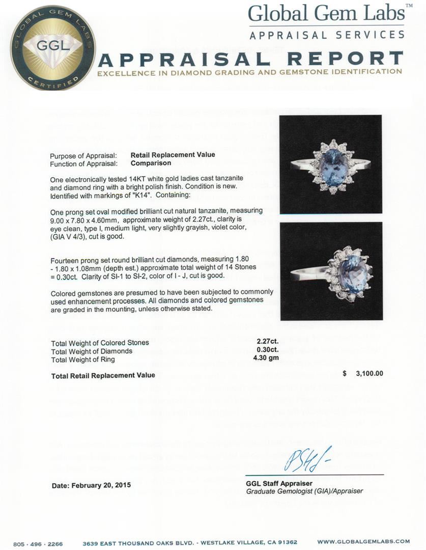 One electronically tested 14KT white gold ladies cast tanzanite and diamond ring with a bright polish finish. Identified with markings of "K14". Condition is new. Containing: One prong set oval modified brilliant cut natural tanzanite, measuring 9.00 x 7.80 x 4.60mm, approximate weight of 2.27ct., clarity is eye clean, type I, medium light, very slightly grayish, violet color, (GIA V 4/3), cut is good. Fourteen prong set round brilliant cut diamonds, measuring 1.80 - 1.80 x 1.08mm (depth est.) approximate total weight of 14 Stones = 0.30ct. Clarity: SI-1 to SI-2. Color: I - J, Cut is Good. Colored gemstones are presumed to have been subjected to commonly used enhancement processes. All diamonds and colored gemstones are graded in the mounting, unless otherwise stated. Total Weight of Colored Stones 2.27ct. Total Weight of Diamonds 0.30ct. Total Weight of Ring 4.30 grams. GGL Appraised at $3,100.00.