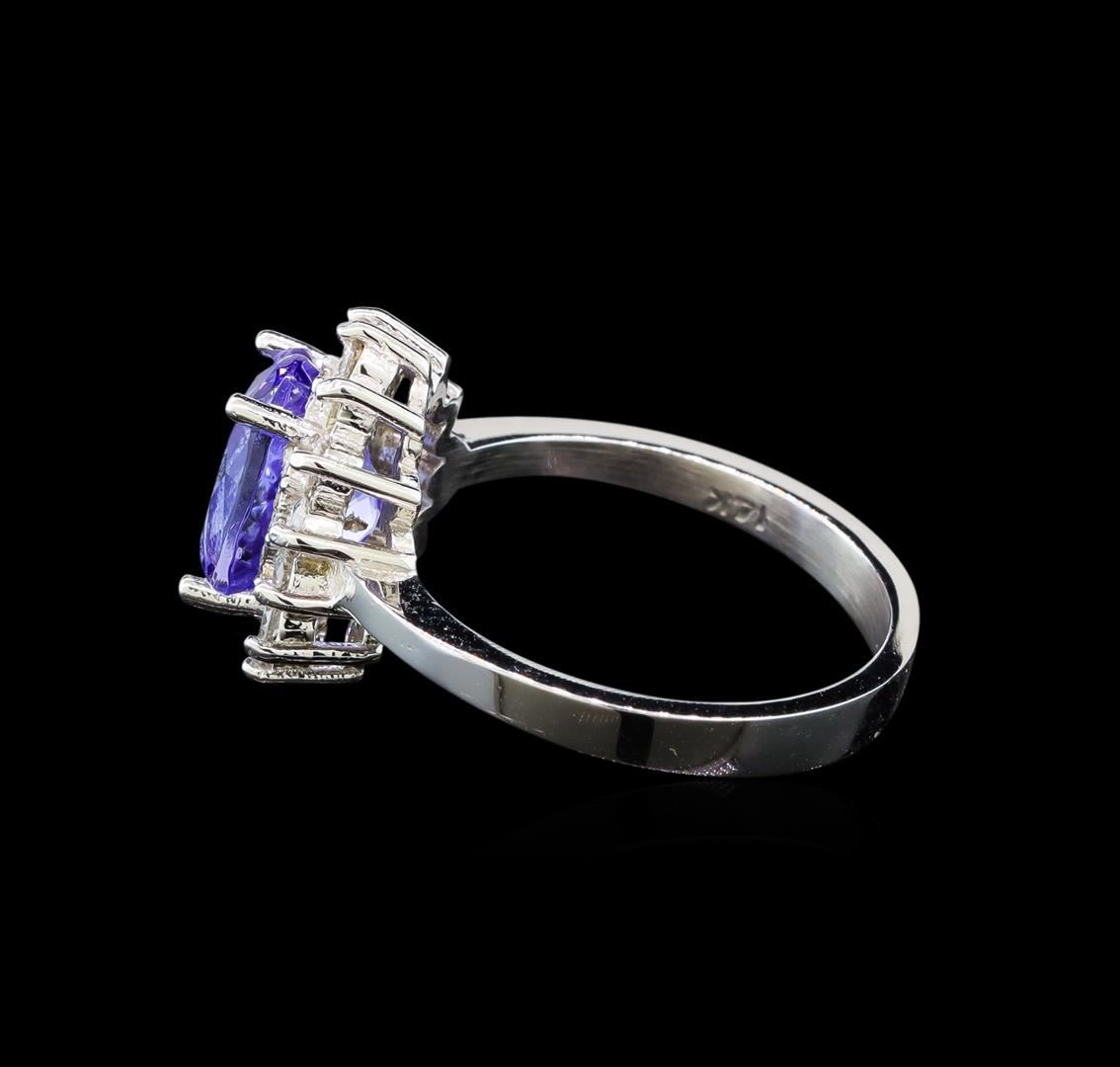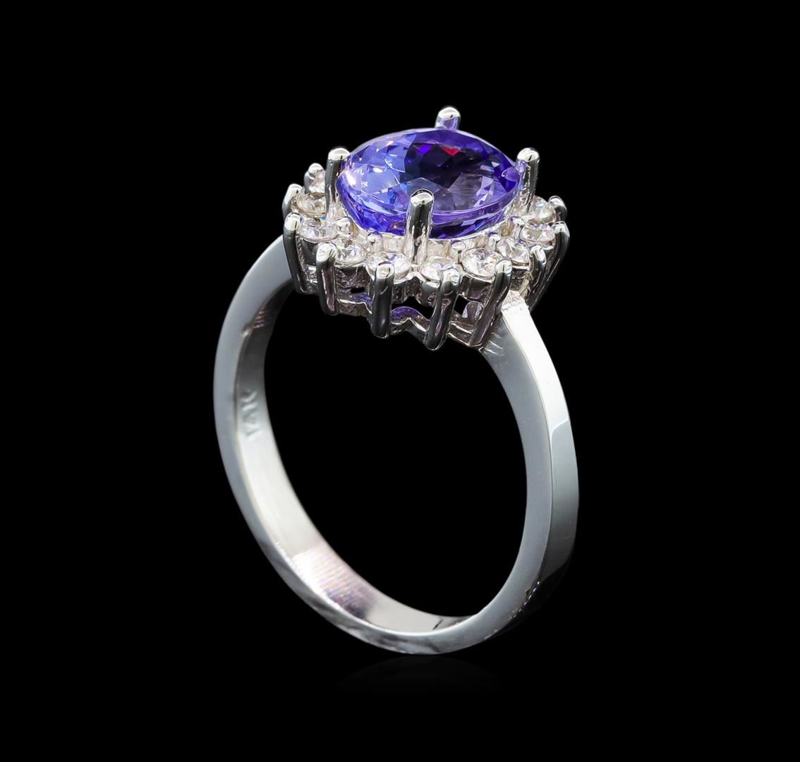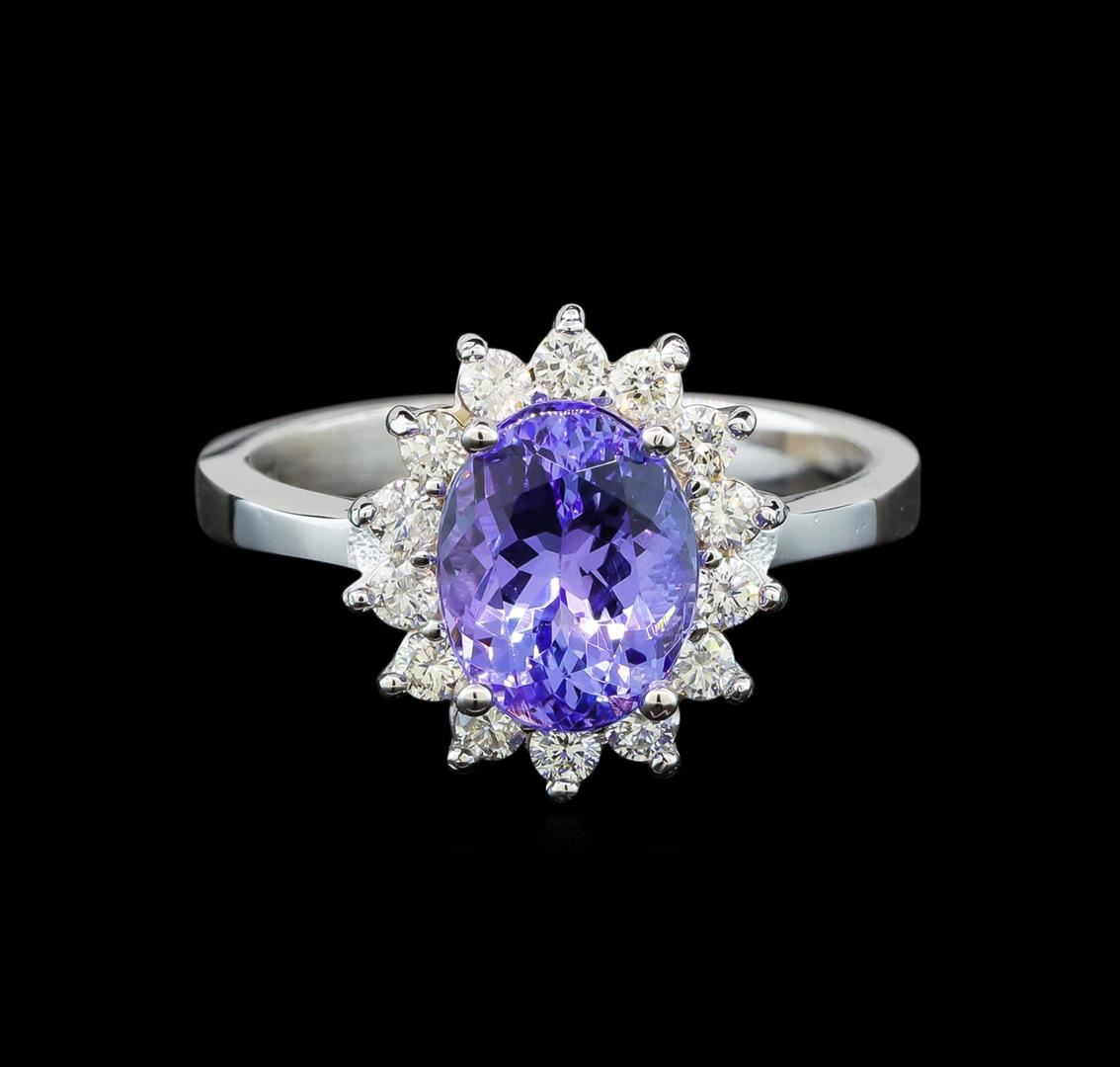 One electronically tested 14KT white gold ladies cast tanzanite and diamond ring with a bright polish finish. Identified with markings of "K14". Condition is new. Containing: One prong set oval modified brilliant cut natural tanzanite, measuring 9.00 x 7.80 x 4.60mm, approximate weight of 2.27ct., clarity is eye clean, type I, medium light, very slightly grayish, violet color, (GIA V 4/3), cut is good. Fourteen prong set round brilliant cut diamonds, measuring 1.80 - 1.80 x 1.08mm (depth est.) approximate total weight of 14 Stones = 0.30ct. Clarity: SI-1 to SI-2. Color: I - J, Cut is Good. Colored gemstones are presumed to have been subjected to commonly used enhancement processes. All diamonds and colored gemstones are graded in the mounting, unless otherwise stated. Total Weight of Colored Stones 2.27ct. Total Weight of Diamonds 0.30ct. Total Weight of Ring 4.30 grams. GGL Appraised at $3,100.00.