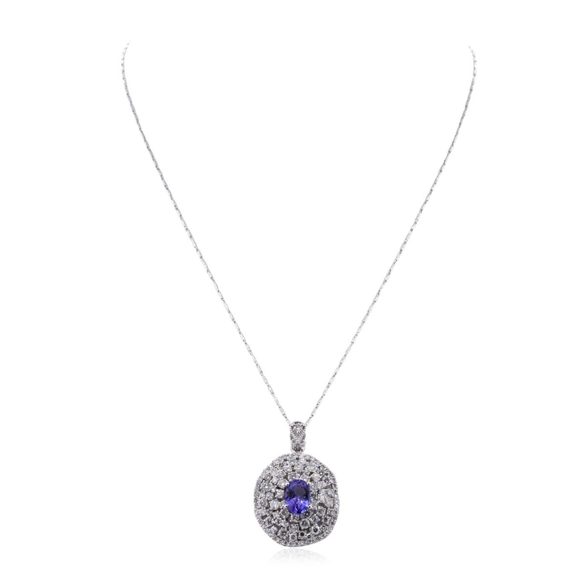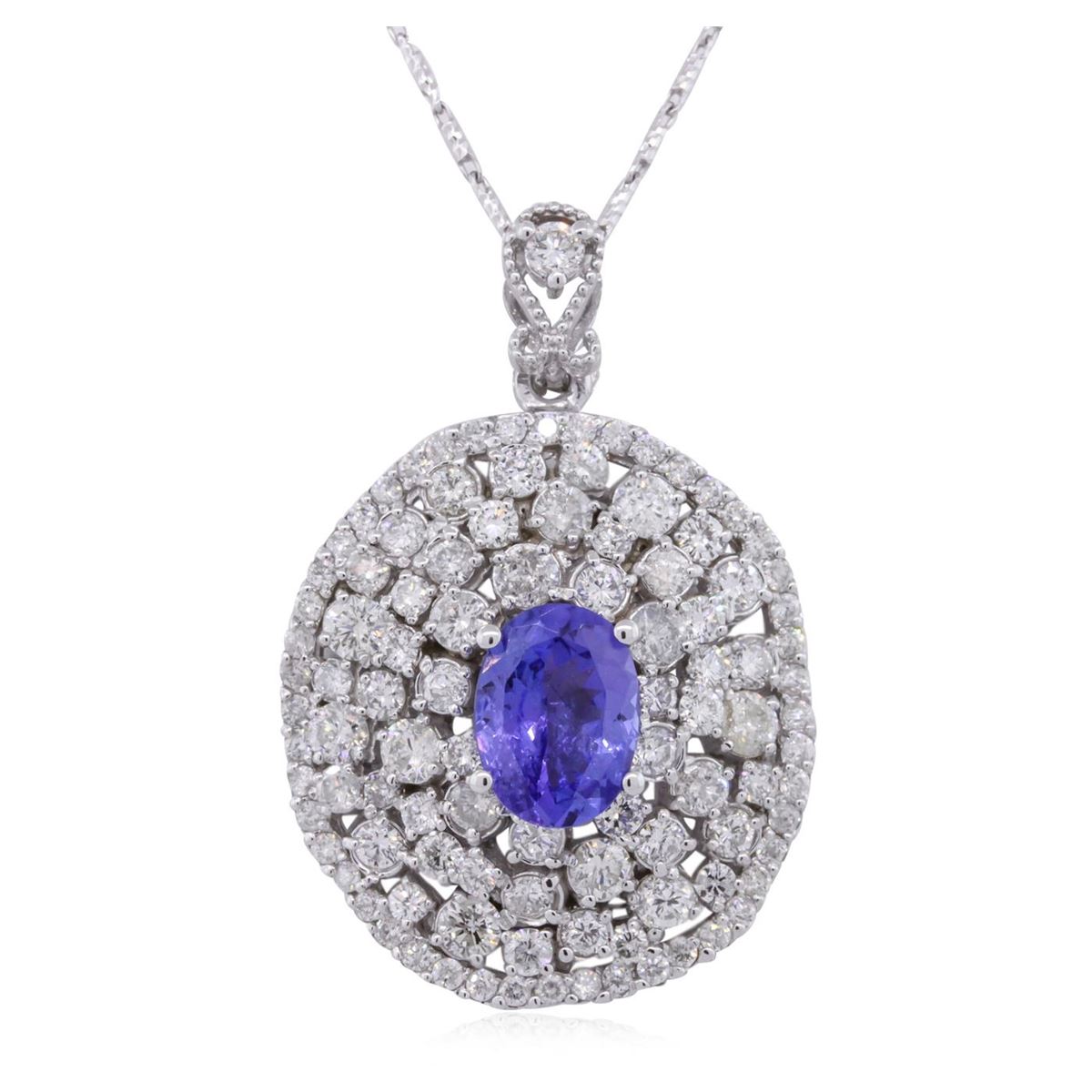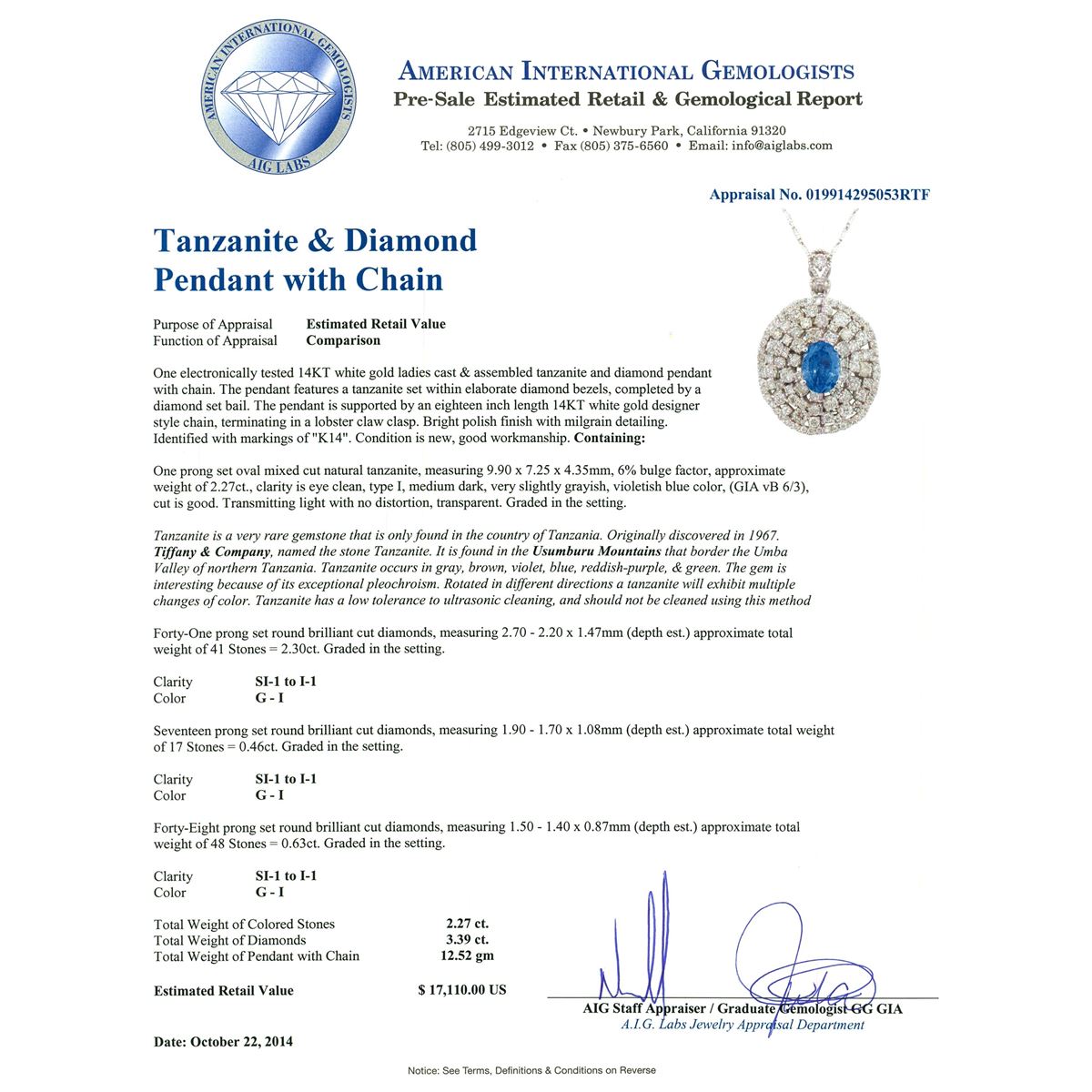One prong set oval mixed cut natural tanzanite, measuring 9.90 x 7.25 x 4.35mm, 6% bulge factor, approximate weight of 2.27ct., clarity is eye clean, type I, medium dark, very slightly grayish, violetish blue color, (GIA vB 6/3), cut is good. Transmitting light with no distortion, transparent. Graded in the setting. Tanzanite is a very rare gemstone that is only found in the country of Tanzania. Originally discovered in 1967. Tiffany & Company, named the stone Tanzanite. The gem is interesting because of its exceptional pleochroism. Rotated in different directions a tanzanite will exhibit multiple changes of color. Tanzanite has a low tolerance to ultrasonic cleaning, and should not be cleaned using this method. Forty-One prong set round brilliant cut diamonds, measuring 2.70 - 2.20 x 1.47mm (depth est.) approximate total weight of 41 Stones = 2.30ct. Graded in the setting. Clarity: SI-1 to I-1. Color: G - I Seventeen prong set round brilliant cut diamonds, measuring 1.90 - 1.70 x 1.08mm (depth est.) approximate total weight of 17 Stones = 0.46ct. Graded in the setting. Clarity: SI-1 to I-1. Color: G - I Forty-Eight prong set round brilliant cut diamonds, measuring 1.50 - 1.40 x 0.87mm (depth est.) approximate total weight of 48 Stones = 0.63ct. Graded in the setting. Clarity: SI-1 to I-1. Color: G - I. Total Weight of Colored Stones 2.27ct. Total Weight of Diamonds 3.39ct. Total Weight of Pendant With Chain 12.52 grams. AIG Appraised at $17,110.00.