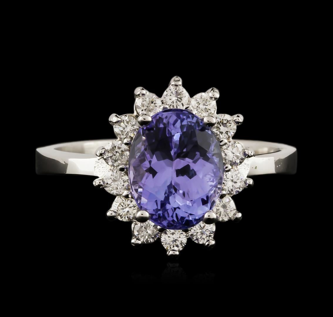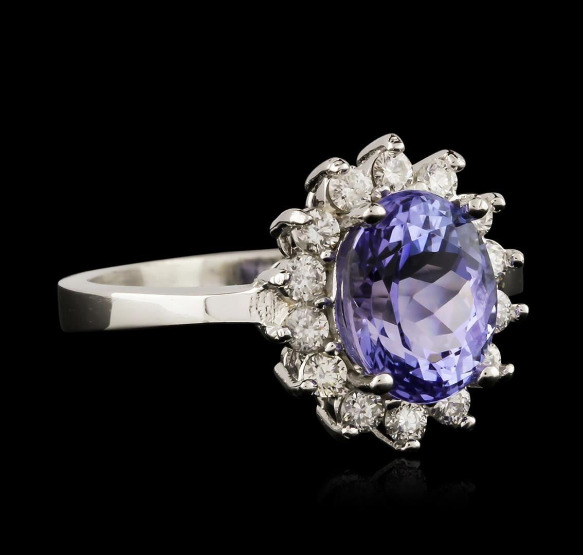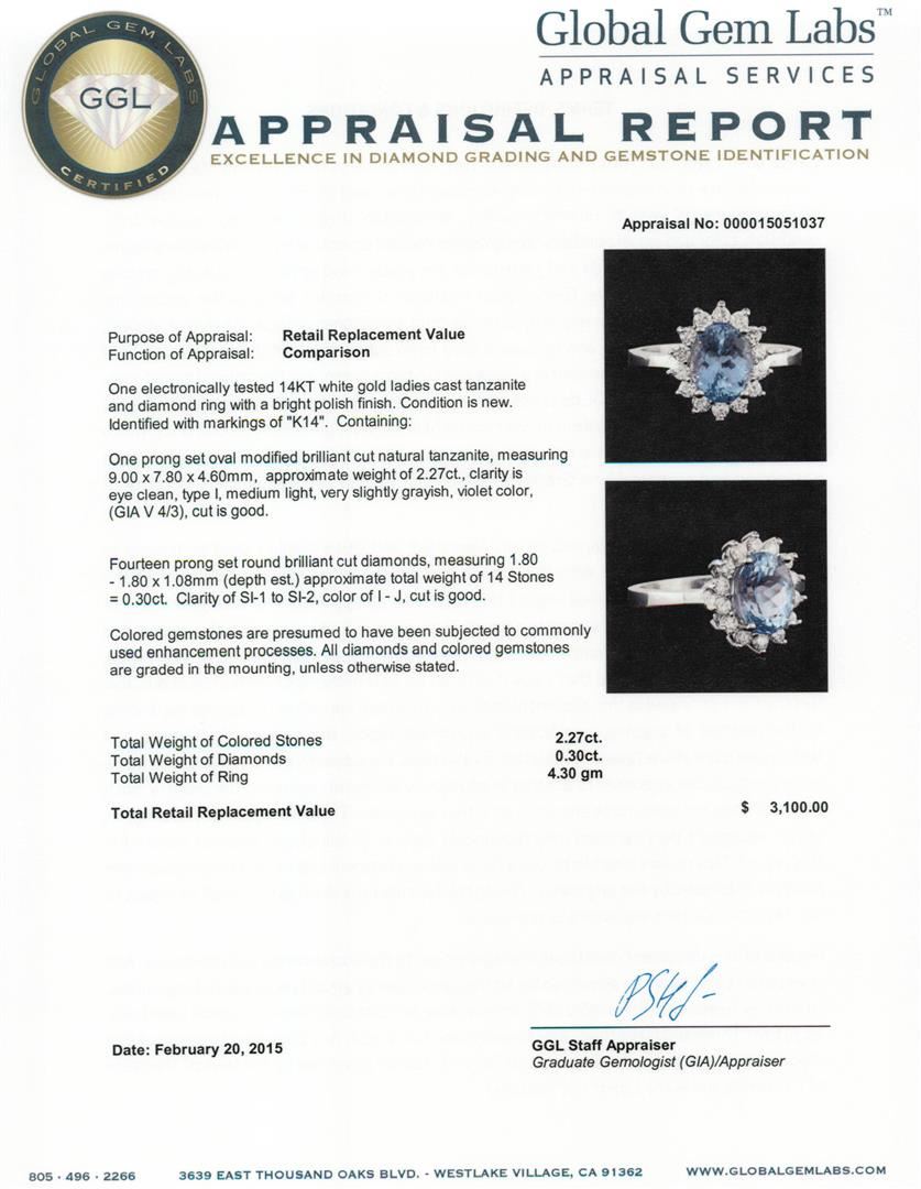 One electronically tested 14KT white gold ladies cast tanzanite and diamond ring with a bright polish finish. Identified with markings of "K14". Condition is new. Containing: One prong set oval modified brilliant cut natural tanzanite, measuring 9.00 x 7.80 x 4.60mm, approximate weight of 2.27ct., clarity is eye clean, type I, medium light, very slightly grayish, violet color, (GIA V 4/3), cut is good. Fourteen prong set round brilliant cut diamonds, measuring 1.80 - 1.80 x 1.08mm (depth est.) approximate total weight of 14 Stones = 0.30ct. Clarity: SI-1 to SI-2. Color: I - J, Cut is Good. Colored gemstones are presumed to have been subjected to commonly used enhancement processes. All diamonds and colored gemstones are graded in the mounting, unless otherwise stated. Total Weight of Colored Stones 2.27ct. Total Weight of Diamonds 0.30ct. Total Weight of Ring 4.30 grams. GGL Appraised at $3,100.00.
