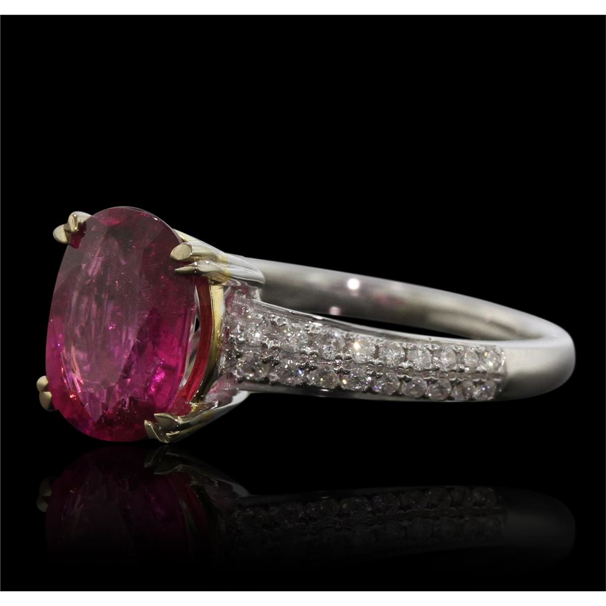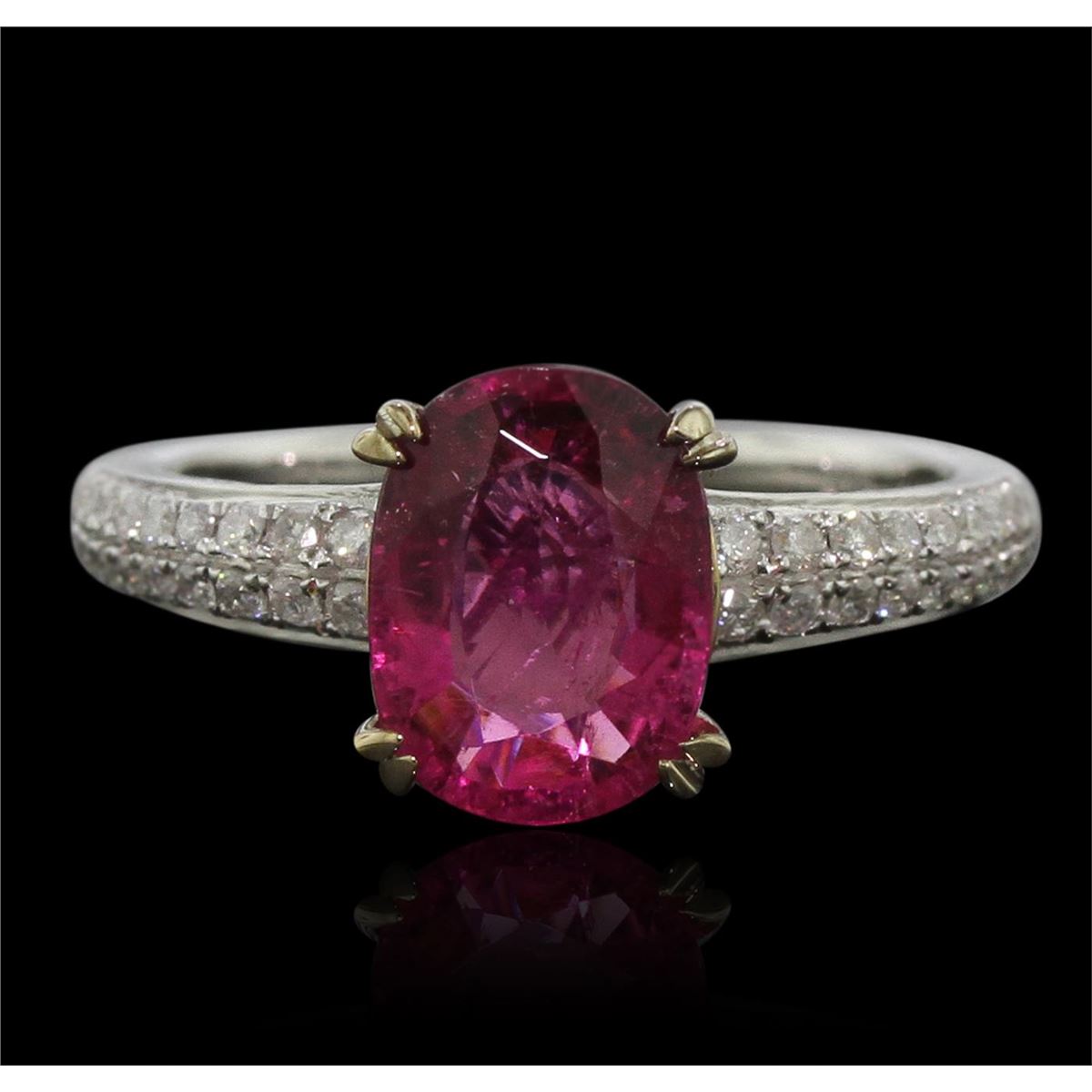 One electronically tested 14KT white gold ladies cast tourmaline and diamond ring with a bright polish finish. Condition is new, good workmanship. The featured tourmaline is supported by diamond set shoulders, completed by a one and one-half millimeter wide band. Identified with markings of "14K". Containing: One prong set oval mixed cut natural pink tourmaline, measuring 9.75 x 7.15 x 4.80mm, 8%. bulge factor, approximate weight of 2.27ct., type II Clarity is moderately included, medium dark, very slightly brownish, purplish pink color, (GIA pPi 6/3), cut is good. Naturally occurring internal & external characteristics are present. Graded in the setting. Thirty-Six pav‚ set round brilliant cut diamonds, measuring 1.40 - 1.10 x 0.75mm (depth est.) approximate. Total Weight of 36 Stones = 0.35ct. Graded in the setting. Clarity: SI-1 to I-1. Color: G - I. Total Weight of Colored Stones 2.27ct. Total Weight of Diamonds 0.35ct. Total Weight of Ring 3.46grams. AIG Appraised at $1,855.00.