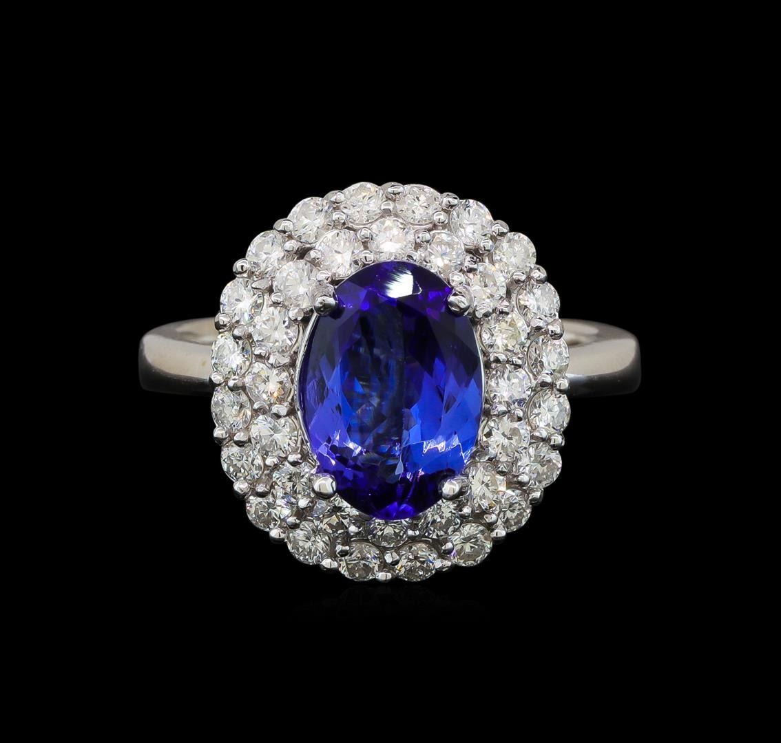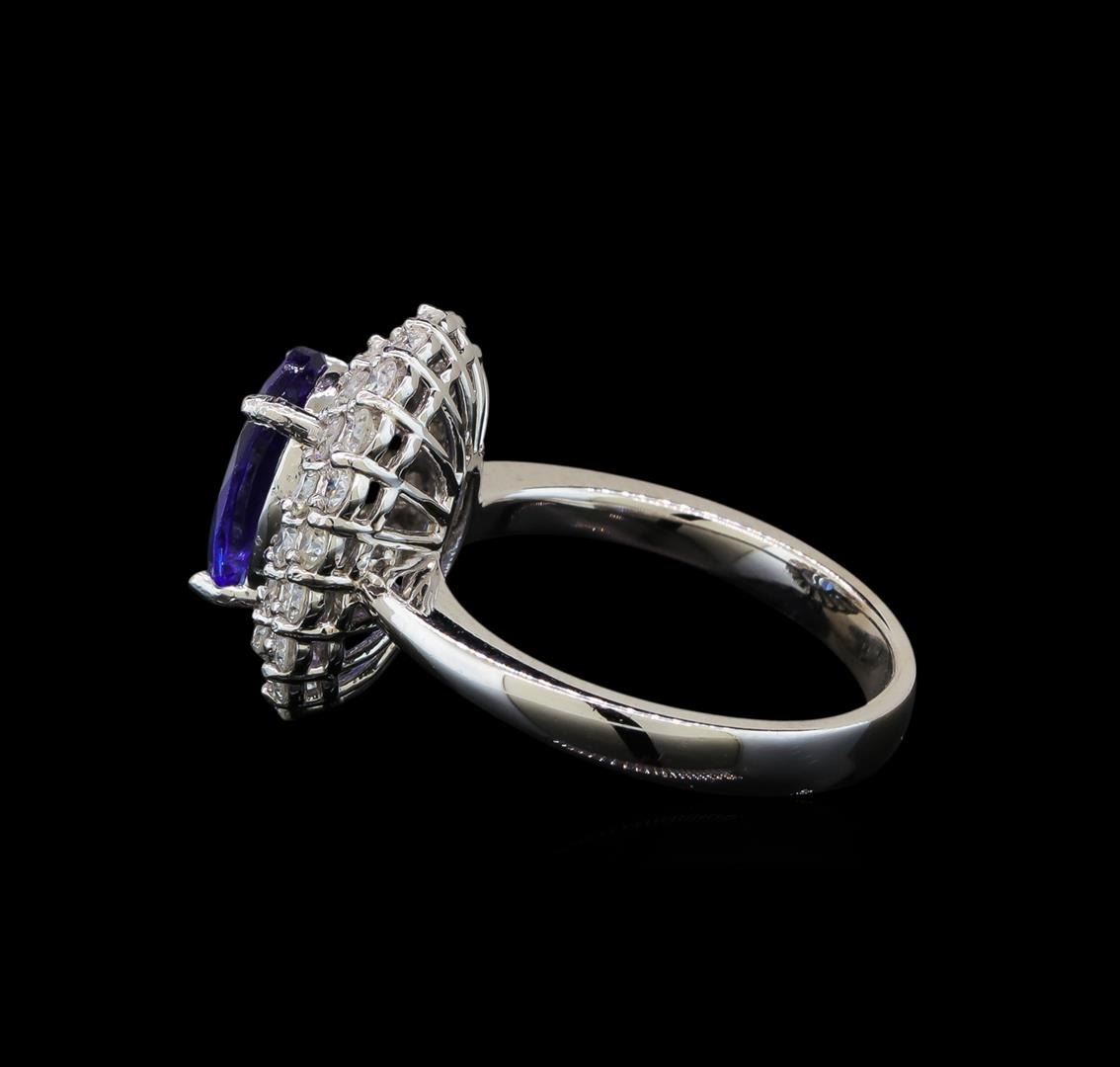 One electronically tested 14KT white gold ladies combination cast & assembled tanzanite and diamond ring with a half round shank with a bright polish finish. Identified with markings of "K14". Condition is new. Containing: One prong set oval modified brilliant cut natural tanzanite, measuring 10.42 x 7.10 x 3.96mm, exact weight 2.28ct., clarity is eye clean, type I, medium light, very slightly grayish, violet color, (GIA V 4/3), cut is good. Thirty-Six prong set round brilliant cut diamonds, measuring 2.00 - 2.00 x 1.20mm (depth est.) approximate total weight of 36 Stones = 1.01ct. Clarity: SI-2 to I-1. Color: H - I, Cut is Good. All diamonds and colored gemstones are graded in the mounting, unless otherwise stated. Colored gemstones are presumed to have been subjected to commonly used enhancement processes.. Total Weight of Colored Stones 2.28ct. Total Weight of Diamonds 1.01ct. Total Weight of Ring 5.90 grams. GGL Appraised at $4,535.00.