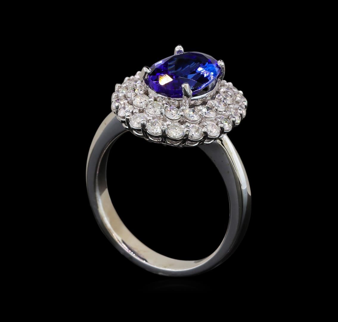 One electronically tested 14KT white gold ladies combination cast & assembled tanzanite and diamond ring with a half round shank with a bright polish finish. Identified with markings of "K14". Condition is new. Containing: One prong set oval modified brilliant cut natural tanzanite, measuring 10.42 x 7.10 x 3.96mm, exact weight 2.28ct., clarity is eye clean, type I, medium light, very slightly grayish, violet color, (GIA V 4/3), cut is good. Thirty-Six prong set round brilliant cut diamonds, measuring 2.00 - 2.00 x 1.20mm (depth est.) approximate total weight of 36 Stones = 1.01ct. Clarity: SI-2 to I-1. Color: H - I, Cut is Good. All diamonds and colored gemstones are graded in the mounting, unless otherwise stated. Colored gemstones are presumed to have been subjected to commonly used enhancement processes.. Total Weight of Colored Stones 2.28ct. Total Weight of Diamonds 1.01ct. Total Weight of Ring 5.90 grams. GGL Appraised at $4,535.00.