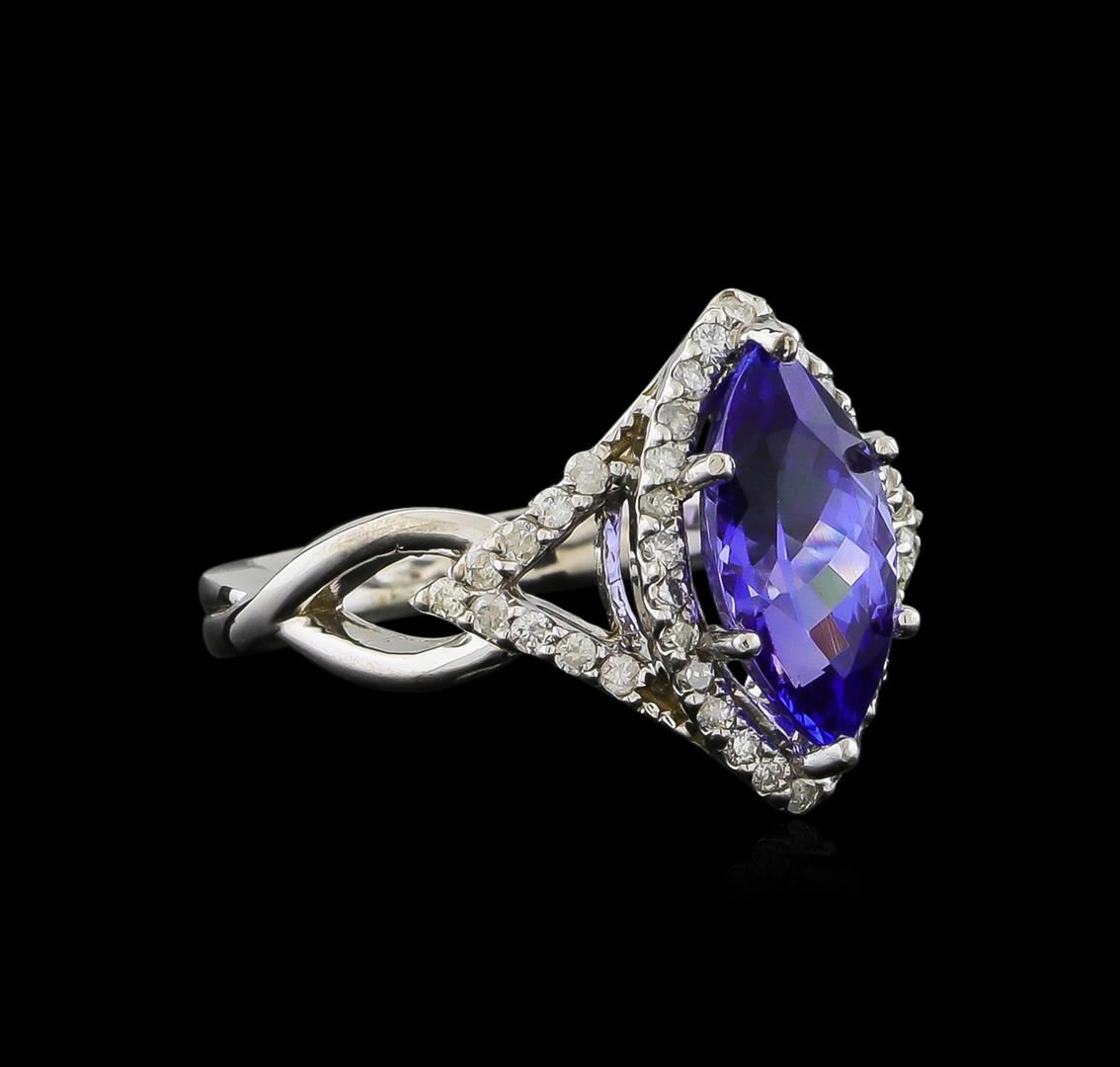 One electronically tested 14KT white gold ladies combination cast & assembled engagement ring with a bright polish finish. Identified with markings of "K14". Condition is new. Containing: One prong set marquise modified brilliant cut natural tanzanite, measuring 13.00 x 6.50 x 4.23mm, approximate weight of 2.28ct., clarity is eye clean, type I, medium, moderately strong, bluish violet color, (GIA bV 5/4), cut is good. Thirty prong set round brilliant cut diamonds, measuring 1.20 - 1.20 x 0.72mm (depth est.) approximate total weight of 30 Stones = 0.19ct. Clarity: I-1 to I-2. Color: I - J, Cut is Good. Colored gemstones are presumed to have been subjected to commonly used enhancement processes. All diamonds and colored gemstones are graded in the mounting, unless otherwise stated. Total Weight of Colored Stones 2.28ct. Total Weight of Diamonds 0.19ct. Total Weight of Ring 5.60 grams. GGL Appraised.