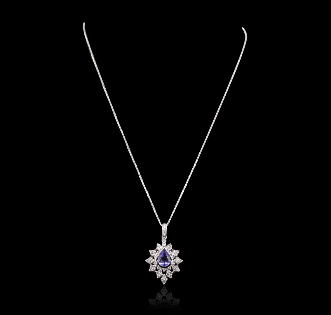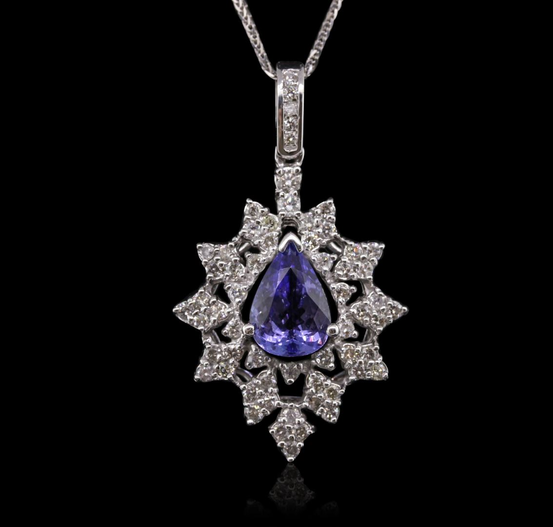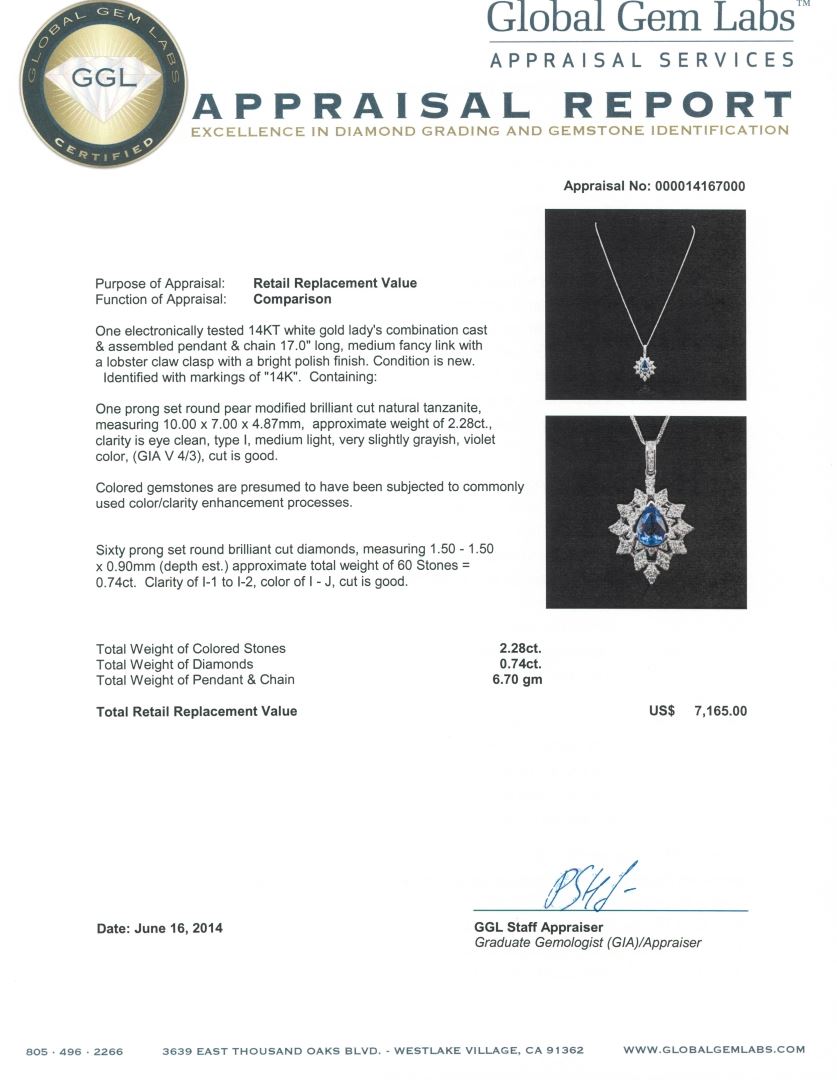 One electronically tested 14KT white gold Ladies combination cast & assembled pendant & chain 17.0" long, medium fancy link with a lobster claw clasp with a bright polish finish. Condition is new. Identified with markings of "14K". Containing: One prong set round pear modified brilliant cut natural tanzanite, measuring 10.00 x 7.00 x 4.87mm, approximate weight of 2.28ct., clarity is eye clean, type I, medium light, very slightly grayish, violet color, (GIA V 4/3), cut is good. Colored gemstones are presumed to have been subjected to commonly used color/clarity enhancement processes. Sixty prong set round brilliant cut diamonds, measuring 1.50 - 1.50 x 0.90mm (depth est.) approximate. Total Weight of 60 Stones = 0.74ct. Clarity: I-1 to I-2. Color: I - J, Cut is Good. Total Weight of Colored Stones 2.28ct. Total Weight of Diamonds 0.74ct. Total Weight of Pendant & Chain 6.70 grams. GGL Appraised at $7,165.00.