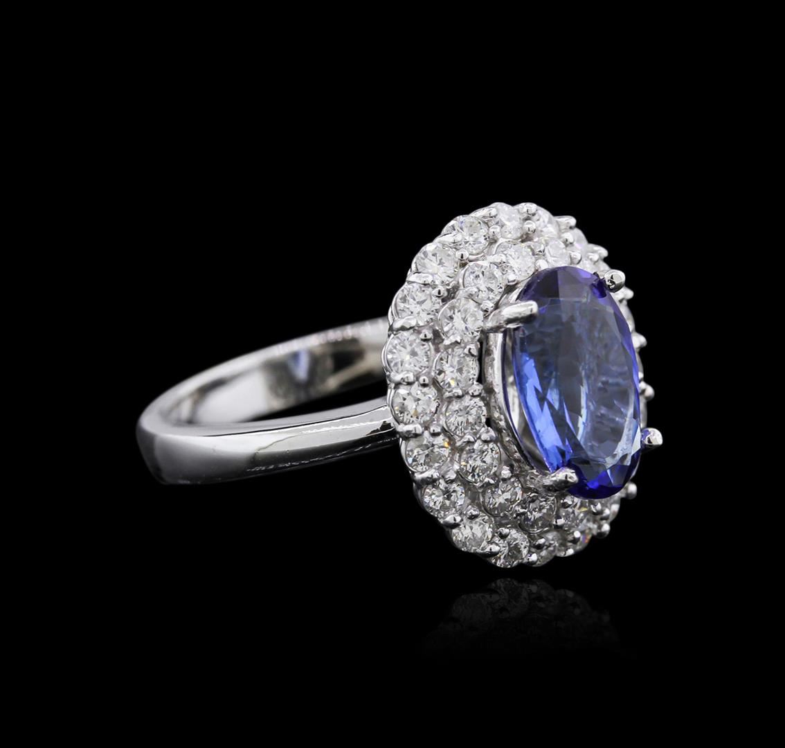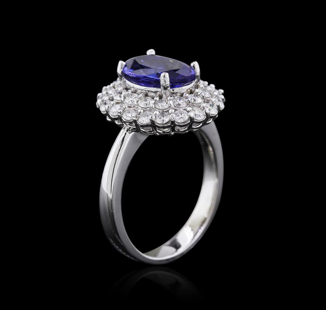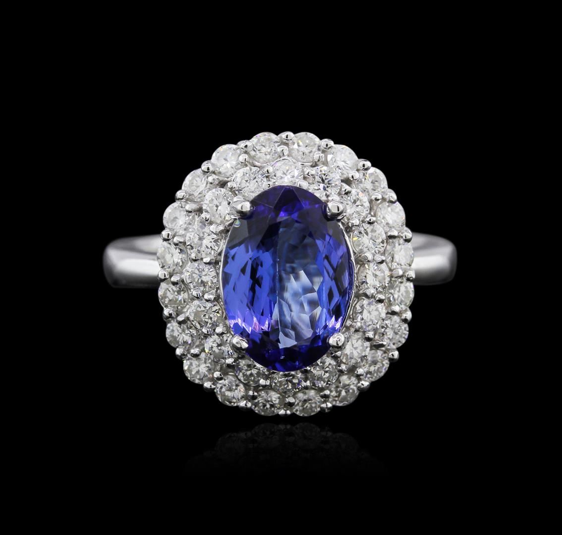 One electronically tested 14KT white gold ladies combination cast & assembled tanzanite and diamond ring with a half round shank with a bright polish finish. Identified with markings of "K14". Condition is new. Containing: One prong set oval modified brilliant cut natural tanzanite, measuring 10.42 x 7.10 x 3.96mm, exact weight 2.28ct., clarity is eye clean, type I, medium light, very slightly grayish, violet color, (GIA V 4/3), cut is good. Thirty-Six prong set round brilliant cut diamonds, measuring 2.00 - 2.00 x 1.20mm (depth est.) approximate total weight of 36 Stones = 1.01ct. Clarity: SI-2 to I-1. Color: H - I, Cut is Good. All diamonds and colored gemstones are graded in the mounting, unless otherwise stated. Colored gemstones are presumed to have been subjected to commonly used enhancement processes.. Total Weight of Colored Stones 2.28ct. Total Weight of Diamonds 1.01ct. Total Weight of Ring 5.90 grams. GGL Appraised at $4,535.00.