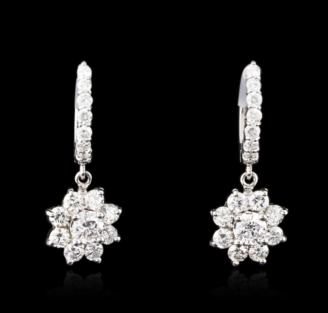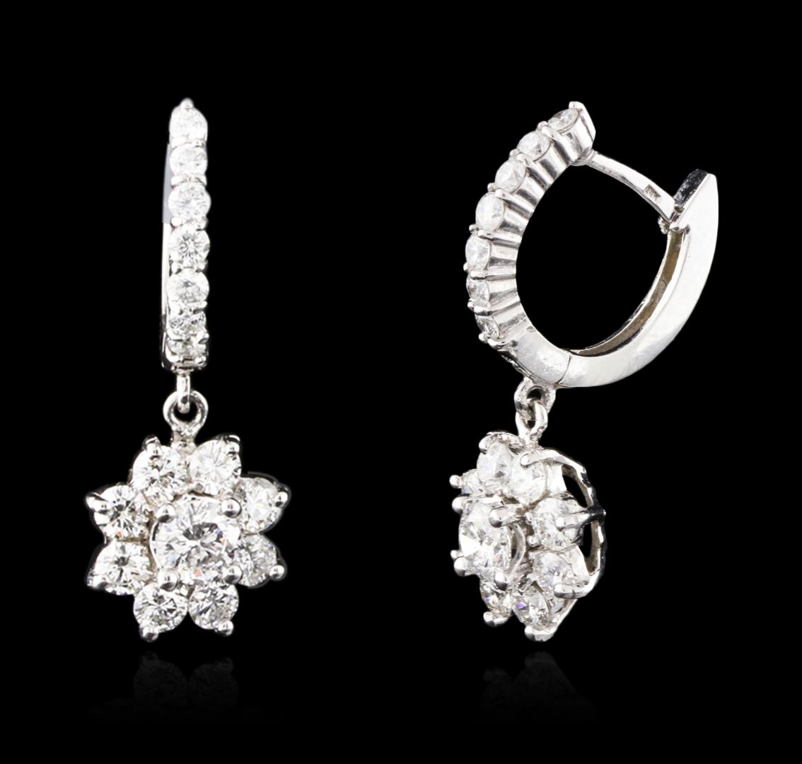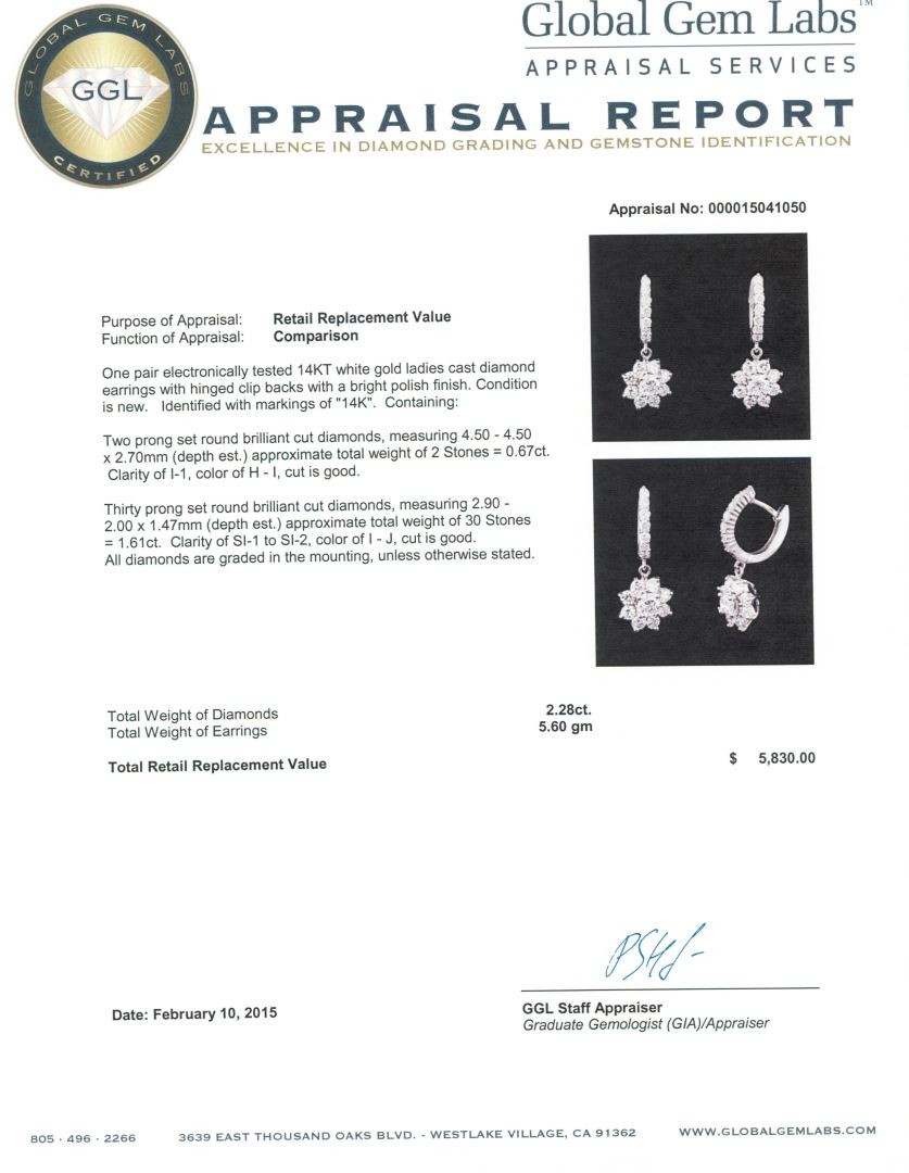 One pair electronically tested 14KT white gold ladies cast diamond earrings with hinged clip backs with a bright polish finish. Identified with markings of "14K". Condition is new. Containing: Two prong set round brilliant cut diamonds, measuring 4.50 - 4.50 x 2.70mm (depth est.) approximate total weight of 2 Stones = 0.67ct. Clarity: I-1. Color: H - I, Cut is Good. Thirty prong set round brilliant cut diamonds, measuring 2.90 - 2.00 x 1.47mm (depth est.) approximate total weight of 30 Stones = 1.61ct. Clarity: SI-1 to SI-2. Color: I - J, Cut is Good. All diamonds are graded in the mounting, unless otherwise stated. Total Weight of Diamonds 2.28ct. Total Weight of Earrings 5.60 grams. GGL Appraised at $5,830.00.