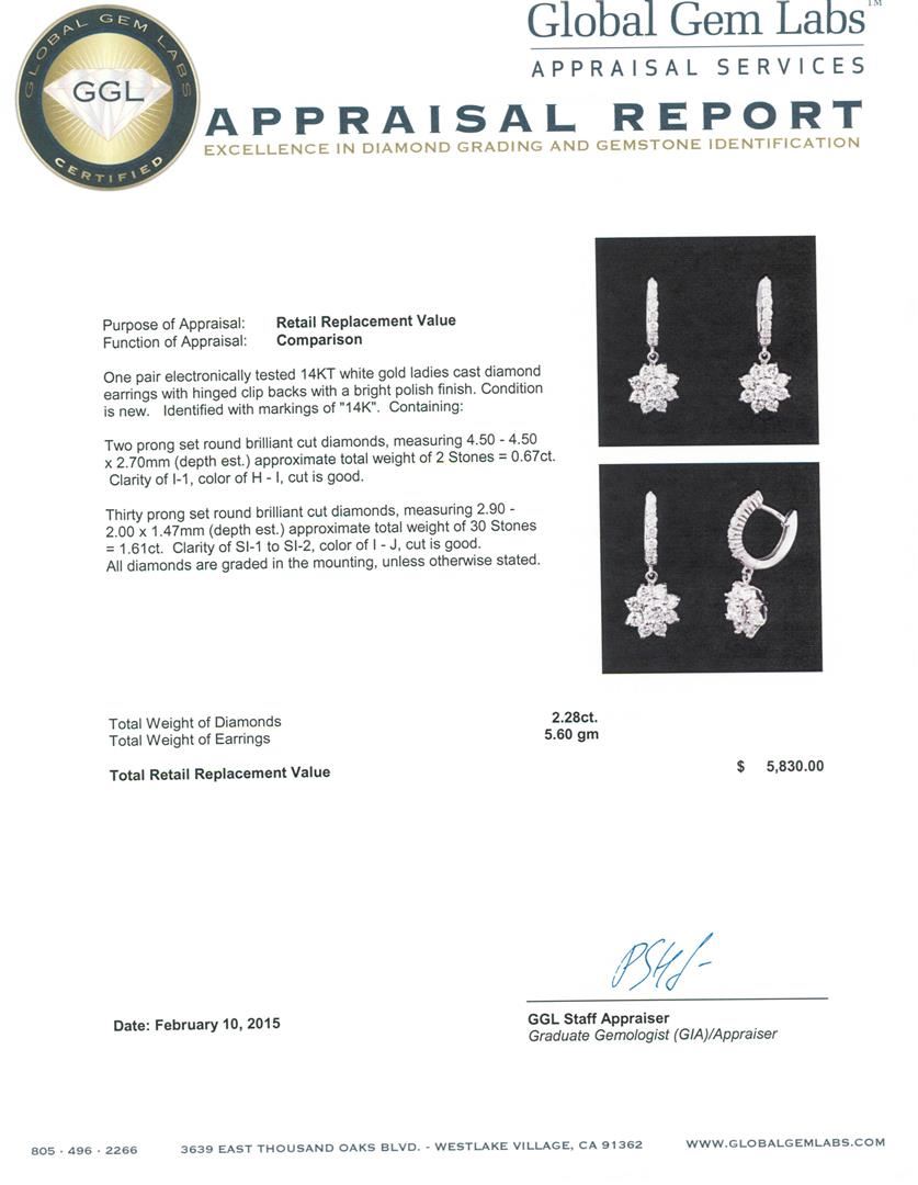One pair electronically tested 14KT white gold ladies cast diamond earrings with hinged clip backs with a bright polish finish. Identified with markings of "14K". Condition is new. Containing: Two prong set round brilliant cut diamonds, measuring 4.50 - 4.50 x 2.70mm (depth est.) approximate total weight of 2 Stones = 0.67ct. Clarity: I-1. Color: H - I, Cut is Good. Thirty prong set round brilliant cut diamonds, measuring 2.90 - 2.00 x 1.47mm (depth est.) approximate total weight of 30 Stones = 1.61ct. Clarity: SI-1 to SI-2. Color: I - J, Cut is Good. All diamonds are graded in the mounting, unless otherwise stated. Total Weight of Diamonds 2.28ct. Total Weight of Earrings 5.60 grams. GGL Appraised at $5,830.00.
