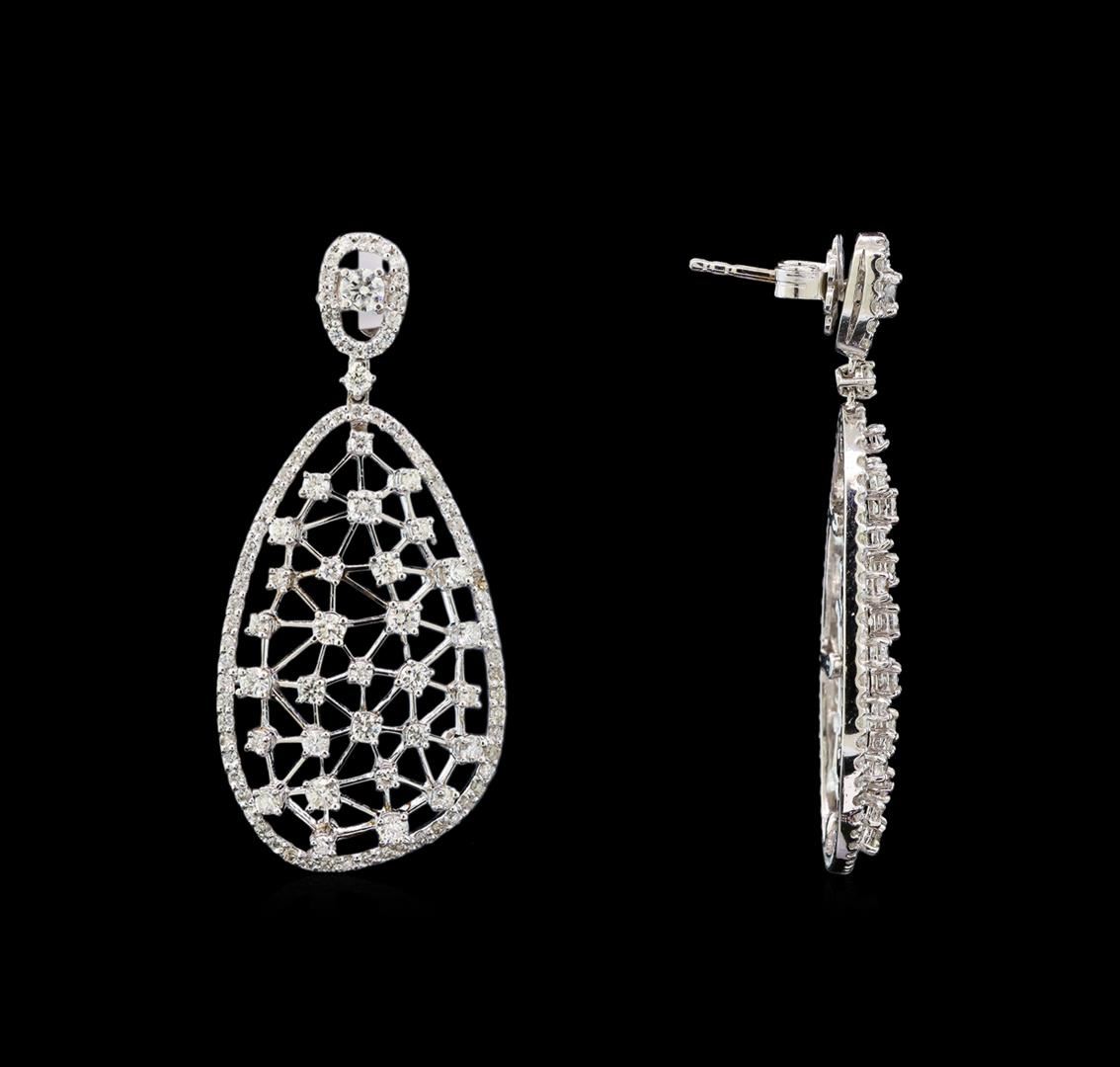 One pair electronically tested 14KT white gold ladies cast diamond earrings with friction posts with a bright polish finish. Identified with markings of "585". Condition is new. Containing: Two prong set round brilliant cut diamonds, measuring 3.00 - 3.00 x 1.80mm (depth est.) approximate total weight of 2 Stones = 0.20ct. Clarity: I-1. Color: H, Cut is Good. Sixty-Two prong set round brilliant cut diamonds, measuring 2.30 - 1.50 x 1.14mm (depth est.) approximate total weight of 62 Stones = 1.56ct. Clarity: SI-1 to SI-2. Color: H - I, Cut is Good. One Hundred Forty-Eight prong set round brilliant cut diamonds, measuring 1.00 - 1.00 x 0.60mm (depth est.) approximate total weight of 148 Stones = 0.53ct. Clarity: I-1 to I-2. Color: I - J. All diamonds are graded in the mounting, unless otherwise stated. Total Weight of Diamonds 2.29ct. Total Weight of Earrings 11.60 grams. GGL Appraised at $7,225.00.