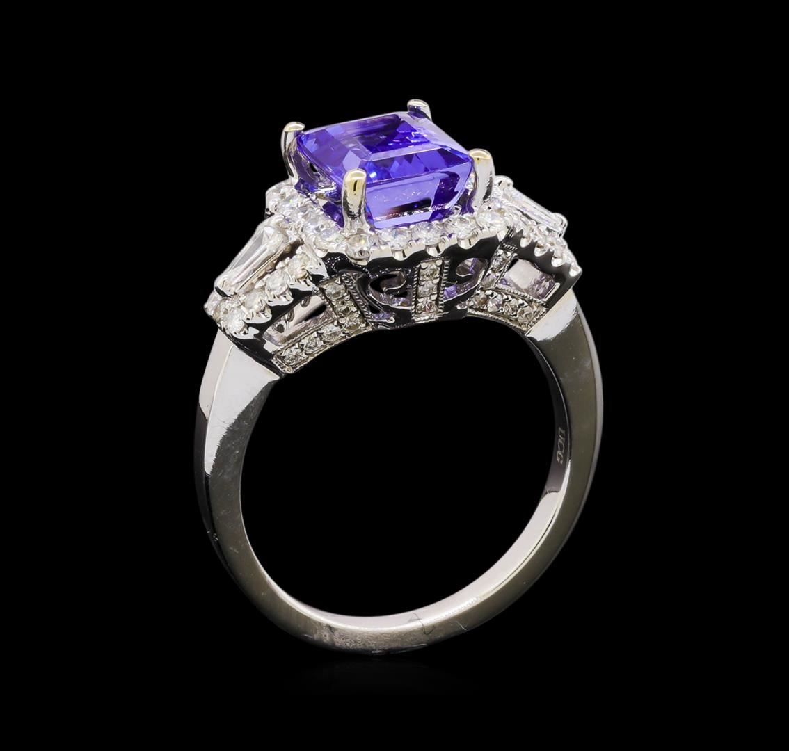 One electronically tested 14KT white gold ladies combination cast & assembled tanzanite and diamond ring with a split shank with a bright polish finish. Identified with markings of "14K". Condition is new. Containing: One prong set emerald standard step cut natural tanzanite, measuring 8.25 x 6.87 x 4.46mm, approximate weight of 2.29ct., clarity is eye clean, type I, medium, very slightly grayish, violet color, (GIA V 5/3), cut is good. Sixty-Eight prong set round brilliant cut diamonds, measuring 1.50 - 1.10 x 0.78mm (depth est.) approximate total weight of 68 Stones = 0.54ct. Clarity: SI-2 to I-1. Color: I - J, Cut is Good. Two prong set baguette cut diamonds, measuring 3.50 x 1.80 x 1.53mm (depth est.) approximate total weight of 2 Stones = 0.18ct. Clarity: SI-1. Color: J, Cut is Good. All colored gemstones are graded in the mounting, unless otherwise stated. All diamonds and colored gemstones are graded in the mounting, unless otherwise stated. Total Weight of Colored Stones 2.29ct. Total Weight of Diamonds 0.72ct. Total Weight of Ring 5.40 grams. GGL Appraised at $6,710.00.