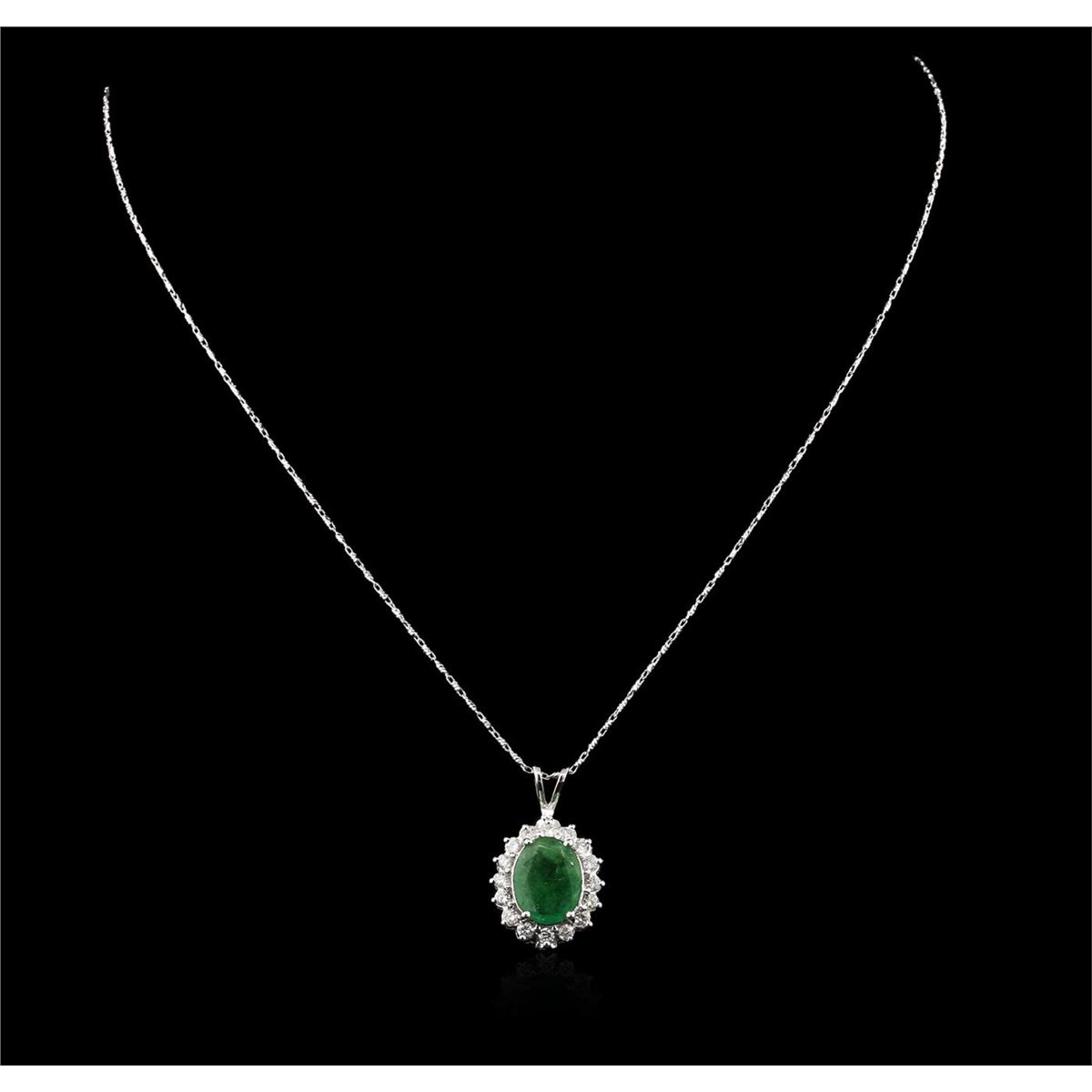 One electronically tested 14KT white gold ladies cast emerald and diamond pendant & chain 18.0" long, with a lobster claw clasp with a bright and brushed finish. Identified with markings of "14K". Condition is new. Containing: One prong set oval modified brilliant cut natural emerald, measuring 11.42 x 8.92 x 3.93mm, approximate weight of 2.29ct., clarity is severely included, type III, medium, very slightly grayish, green color, (GIA G 5/3), cut is good. Sixteen prong set round brilliant cut diamonds, measuring 2.00 - 2.00 x 1.20mm (depth est.) approximate total weight of 16 Stones = 0.47ct. Clarity: SI-1 to SI-2. Color: J - K, Cut is Good. Colored gemstones are presumed to have been subjected to commonly used enhancement processes. All diamonds and colored gemstones are graded in the mounting, unless otherwise stated. Total Weight of Colored Stones 2.29ct. Total Weight of Diamonds 0.47ct. Total Weight of Pendant & Chain 5.30 grams. GGL Appraised at $3,215.00.