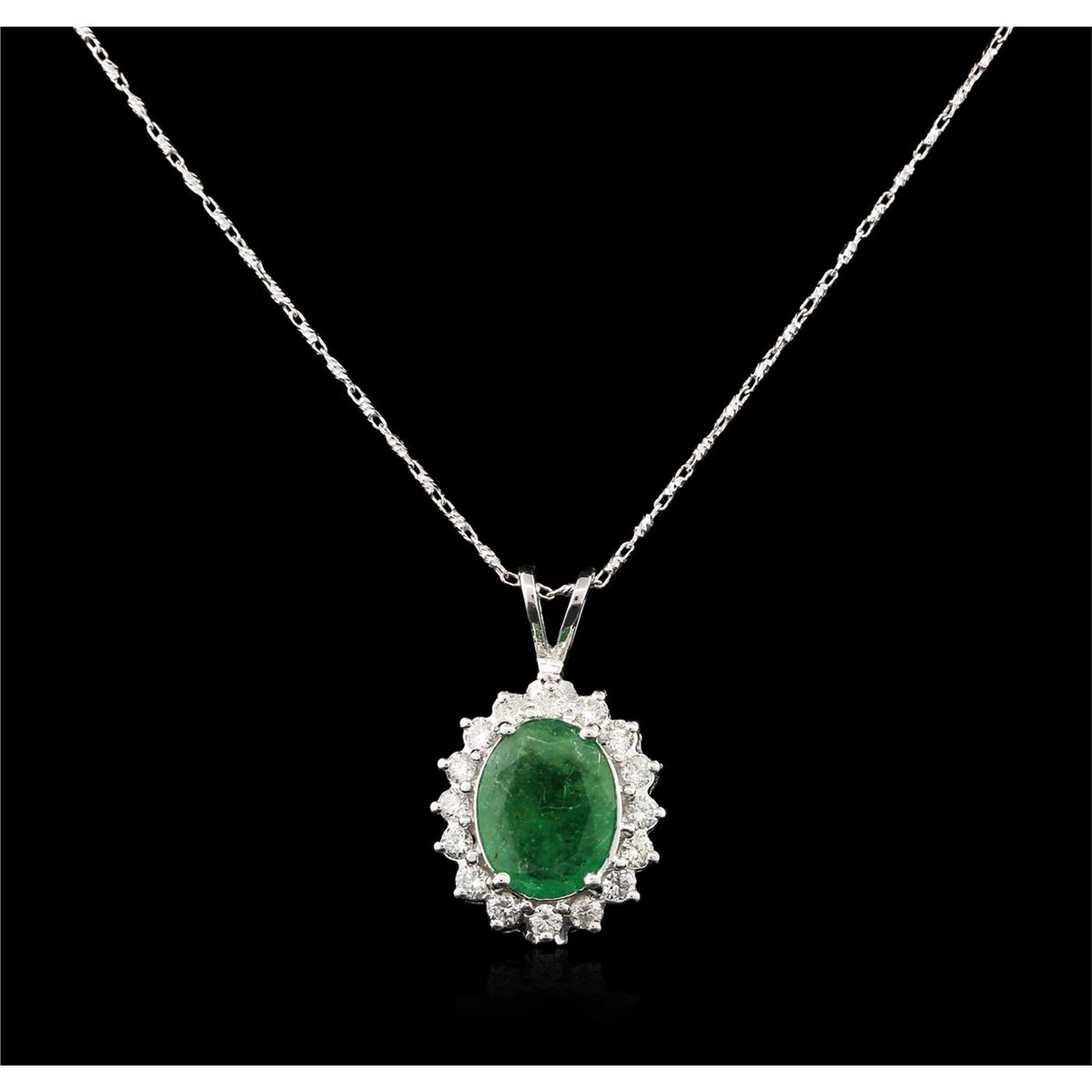 One electronically tested 14KT white gold ladies cast emerald and diamond pendant & chain 18.0" long, with a lobster claw clasp with a bright and brushed finish. Identified with markings of "14K". Condition is new. Containing: One prong set oval modified brilliant cut natural emerald, measuring 11.42 x 8.92 x 3.93mm, approximate weight of 2.29ct., clarity is severely included, type III, medium, very slightly grayish, green color, (GIA G 5/3), cut is good. Sixteen prong set round brilliant cut diamonds, measuring 2.00 - 2.00 x 1.20mm (depth est.) approximate total weight of 16 Stones = 0.47ct. Clarity: SI-1 to SI-2. Color: J - K, Cut is Good. Colored gemstones are presumed to have been subjected to commonly used enhancement processes. All diamonds and colored gemstones are graded in the mounting, unless otherwise stated. Total Weight of Colored Stones 2.29ct. Total Weight of Diamonds 0.47ct. Total Weight of Pendant & Chain 5.30 grams. GGL Appraised at $3,215.00.