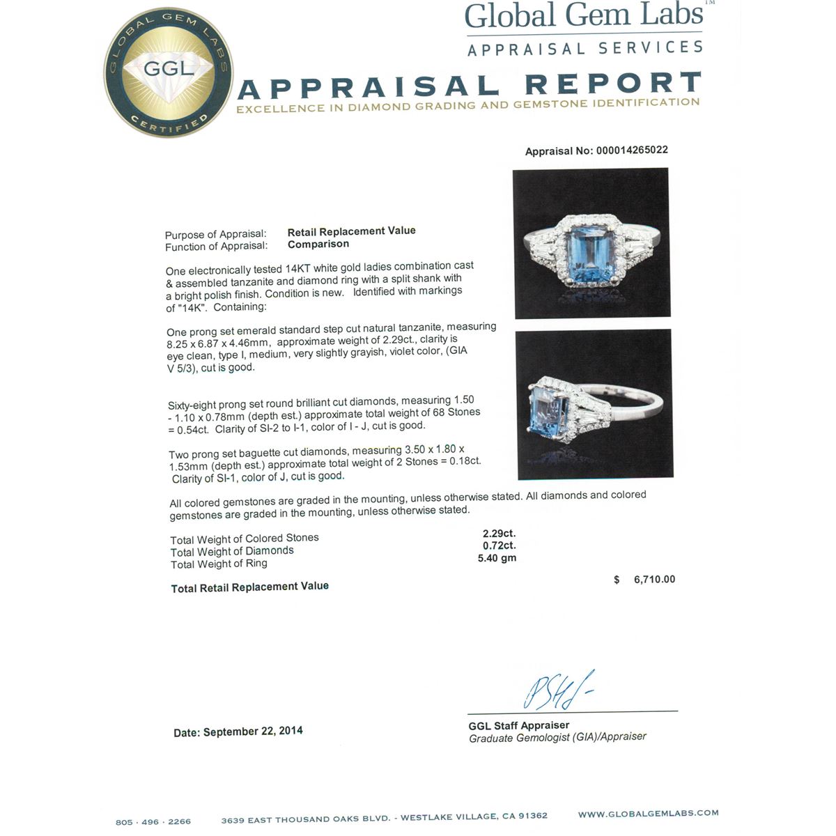 One electronically tested 14KT white gold ladies combination cast & assembled tanzanite and diamond ring with a split shank with a bright polish finish. Identified with markings of "14K". Condition is new. Containing: One prong set emerald standard step cut natural tanzanite, measuring 8.25 x 6.87 x 4.46mm, approximate weight of 2.29ct., clarity is eye clean, type I, medium, very slightly grayish, violet color, (GIA V 5/3), cut is good. Sixty-Eight prong set round brilliant cut diamonds, measuring 1.50 - 1.10 x 0.78mm (depth est.) approximate total weight of 68 Stones = 0.54ct. Clarity: SI-2 to I-1. Color: I - J, Cut is Good. Two prong set baguette cut diamonds, measuring 3.50 x 1.80 x 1.53mm (depth est.) approximate total weight of 2 Stones = 0.18ct. Clarity: SI-1. Color: J, Cut is Good. All colored gemstones are graded in the mounting, unless otherwise stated. All diamonds and colored gemstones are graded in the mounting, unless otherwise stated. Total Weight of Colored Stones 2.29ct. Total Weight of Diamonds 0.72ct. Total Weight of Ring 5.40 grams. GGL Appraised at $6,710.00.
