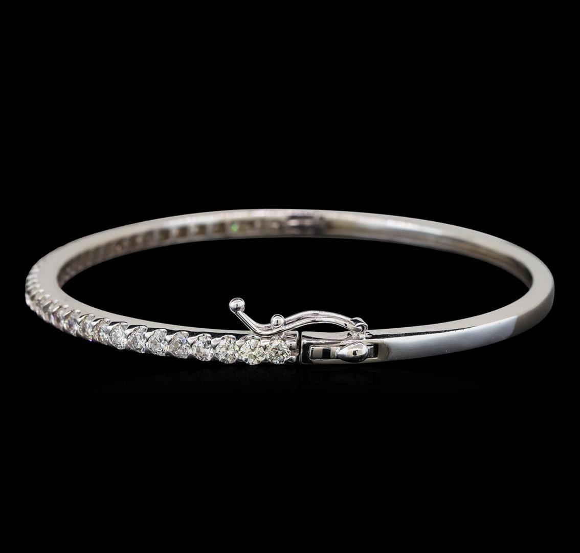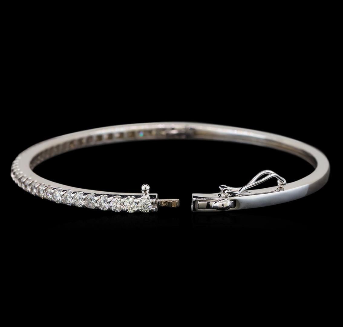 One electronically tested 14KT white gold ladies combination cast & assembled diamond bangle bracelet with a hidden box clasp with safety closer with a bright polish finish. The inside diameter of the bracelet is 2-1/4" wide Condition is new. Containing: Thirty-Six prong set round brilliant cut diamonds, measuring 2.70 - 2.50 x 1.56mm (depth est.) exact total weight 36 Stones = 2.30ct. Clarity: SI-1 to SI-2. Color: I - J, Cut is Good. All diamonds are graded in the mounting, unless otherwise stated. Total Weight of Diamonds 2.30ct. Total Weight of Bangle Bracelet 12.30 grams. GGL Appraised at $5,460.00.
