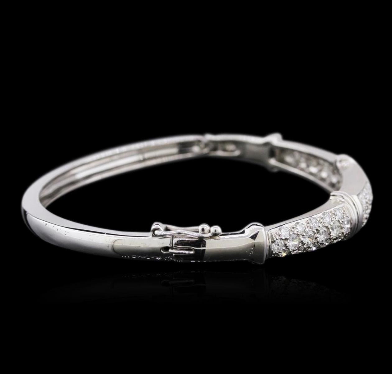 One electronically tested 14KT white gold ladies cast diamond bangle bracelet with a hidden box clasp with safety closer with a bright polish finish. Identified with markings of "14K". Condition is new. Containing: Fifty-One prong set round brilliant cut diamonds, measuring 2.50 - 1.80 x 1.29mm (depth est.) approximate total weight of 51 Stones = 2.30 ct. Clarity: VS-2 to SI-1. Color: H - I, Cut is Good. Diamonds are graded in the mounting, unless otherwise stated. Total Weight of Diamonds 2.30 ct. Total Weight of Bangle Bracelet 20.60 grams. GGL Appraised.