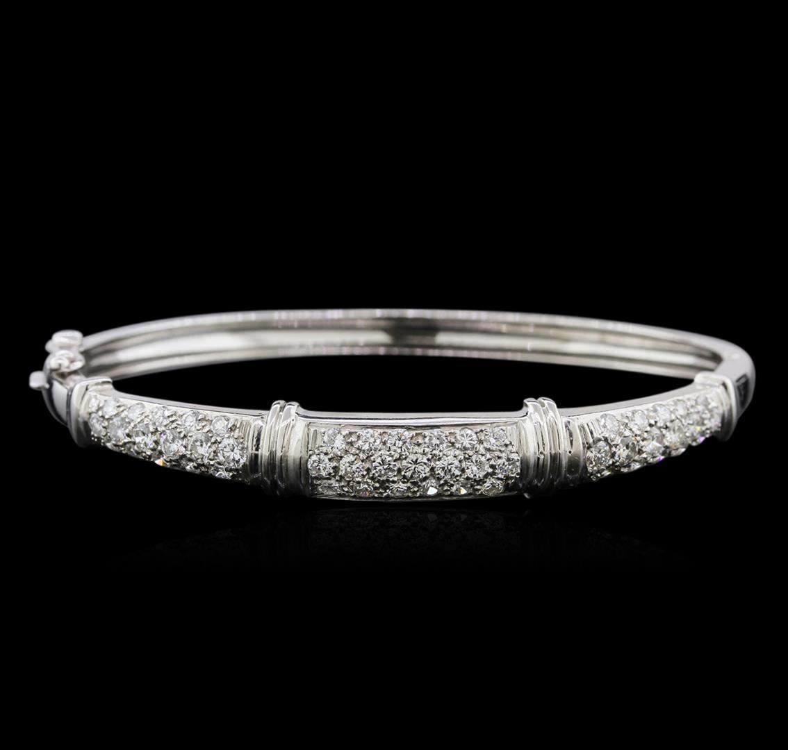 One electronically tested 14KT white gold ladies cast diamond bangle bracelet with a hidden box clasp with safety closer with a bright polish finish. Identified with markings of "14K". Condition is new. Containing: Fifty-One prong set round brilliant cut diamonds, measuring 2.50 - 1.80 x 1.29mm (depth est.) approximate total weight of 51 Stones = 2.30 ct. Clarity: VS-2 to SI-1. Color: H - I, Cut is Good. Diamonds are graded in the mounting, unless otherwise stated. Total Weight of Diamonds 2.30 ct. Total Weight of Bangle Bracelet 20.60 grams. GGL Appraised.