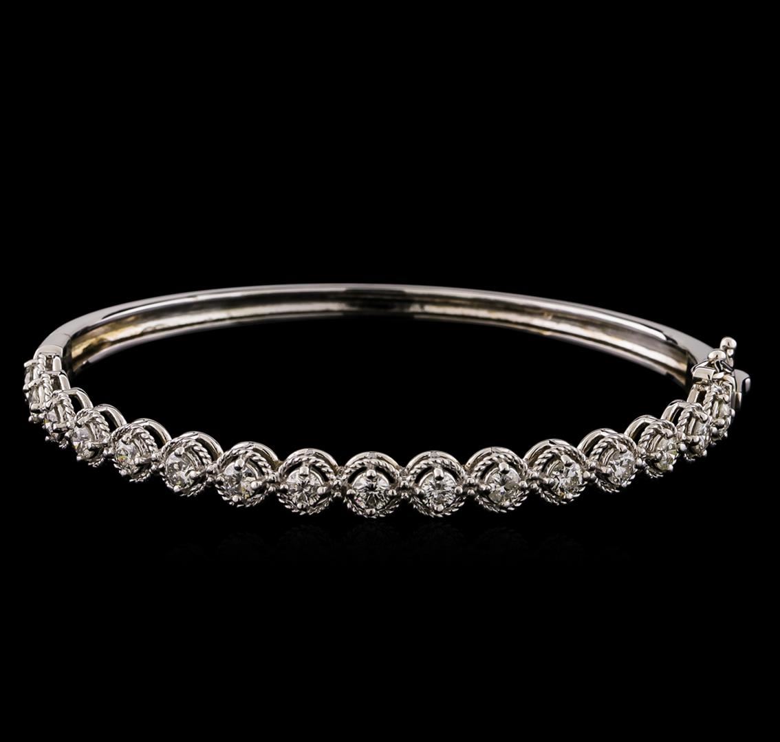 One electronically tested 14KT white gold ladies combination cast & assembled bangle bracelet with a hidden box clasp with a bright polish finish. Condition is new. Identified with markings of "14K". Containing: Sixteen prong set round brilliant cut diamonds, measuring 3.40 - 3.40 x 2.04mm (depth est.) approximate total weight of 16 Stones = 2.30 ct. Clarity: SI-2 to I-1. Color: I - J, Cut is Good. All diamonds are graded in the mounting, unless otherwise stated. Total Weight of Diamonds 2.30 ct. Total Weight of Bracelet 12.70 grams. GGL Appraised.