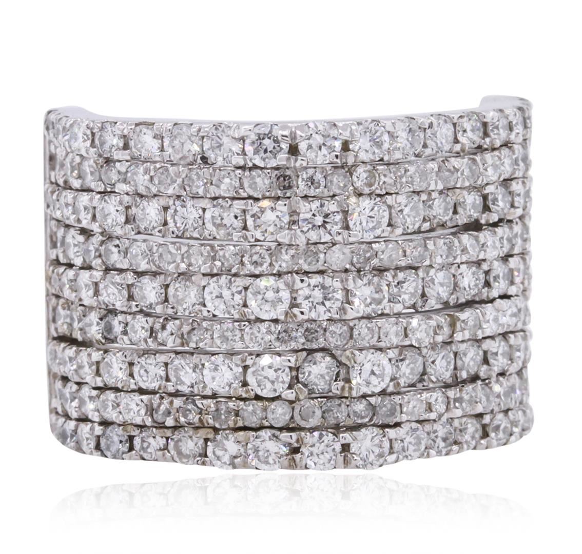 One electronically tested 14KT white gold ladies cast diamond ring with a bright polish finish. The ring features an elaborate diamond set curvature, completed by a four and one-half millimeter wide band. Identified with markings of 14K. Condition is new, good workmanship. Containing: One Hundred Seventy-Eight prong set round brilliant cut diamonds, measuring 1.80 - 1.20 x 0.90mm (depth est.) approximate total weight of 178 Stones = 2.30ct. Graded in the setting. Clarity: SI-2 to I-2. Color: G - I. Total Weight of Diamonds 2.30ct. Total Weight of Ring 12.77 grams. AIG Appraised at $8,610.00.