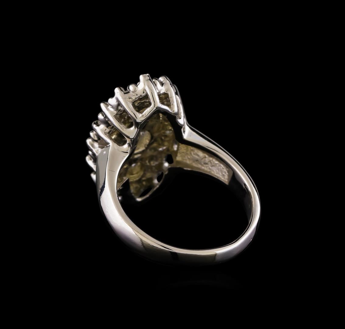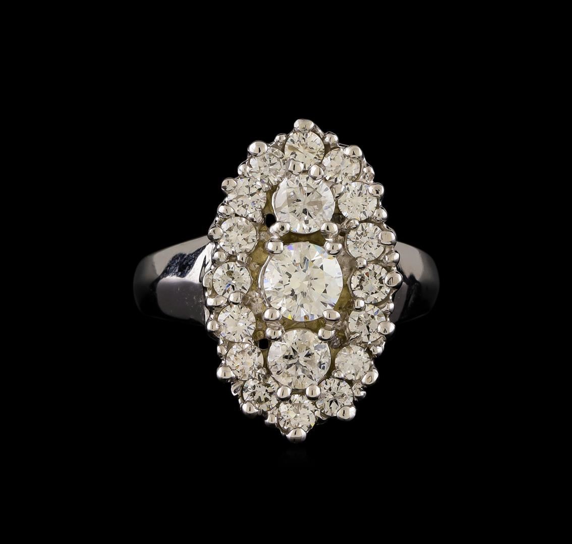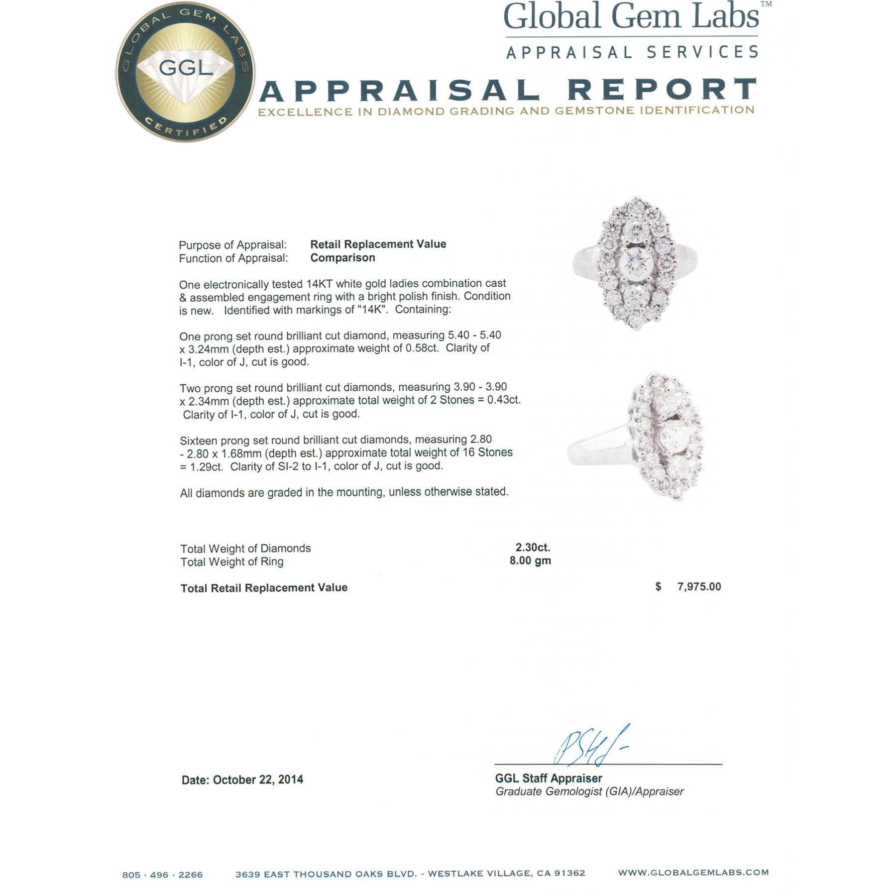 One electronically tested 14KT white gold ladies combination cast & assembled engagement ring with a bright polish finish. Identified with markings of "14K". Condition is new. Containing: One prong set round brilliant cut diamond, measuring 5.40 - 5.40 x 3.24mm (depth est.) approximate weight of 0.58ct. Clarity: I-1. Color: J, Cut is Good. Two prong set round brilliant cut diamonds, measuring 3.90 - 3.90 x 2.34mm (depth est.) approximate total weight of 2 Stones = 0.43ct. Clarity: I-1. Color: J, Cut is Good. Sixteen prong set round brilliant cut diamonds, measuring 2.80 - 2.80 x 1.68mm (depth est.) approximate total weight of 16 Stones = 1.29ct. Clarity: SI-2 to I-1. Color: J, Cut is Good. All diamonds are graded in the mounting, unless otherwise stated. Total Weight of Diamonds 2.30ct. Total Weight of Ring 8.00 grams. GGL Appraised at $7,975.00.