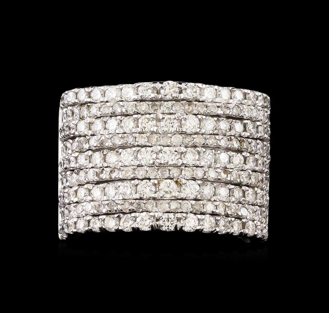 One electronically tested 14KT white gold ladies cast diamond ring with a bright polish finish. The ring features an elaborate diamond set curvature, completed by a four and one-half millimeter wide band. Identified with markings of 14K. Condition is new, good workmanship. Containing: One Hundred Seventy-Eight prong set round brilliant cut diamonds, measuring 1.80 - 1.20 x 0.90mm (depth est.) approximate total weight of 178 Stones = 2.30ct. Graded in the setting. Clarity: SI-2 to I-2. Color: G - I. Total Weight of Diamonds 2.30ct. Total Weight of Ring 12.77 grams. AIG Appraised at $8,610.00.