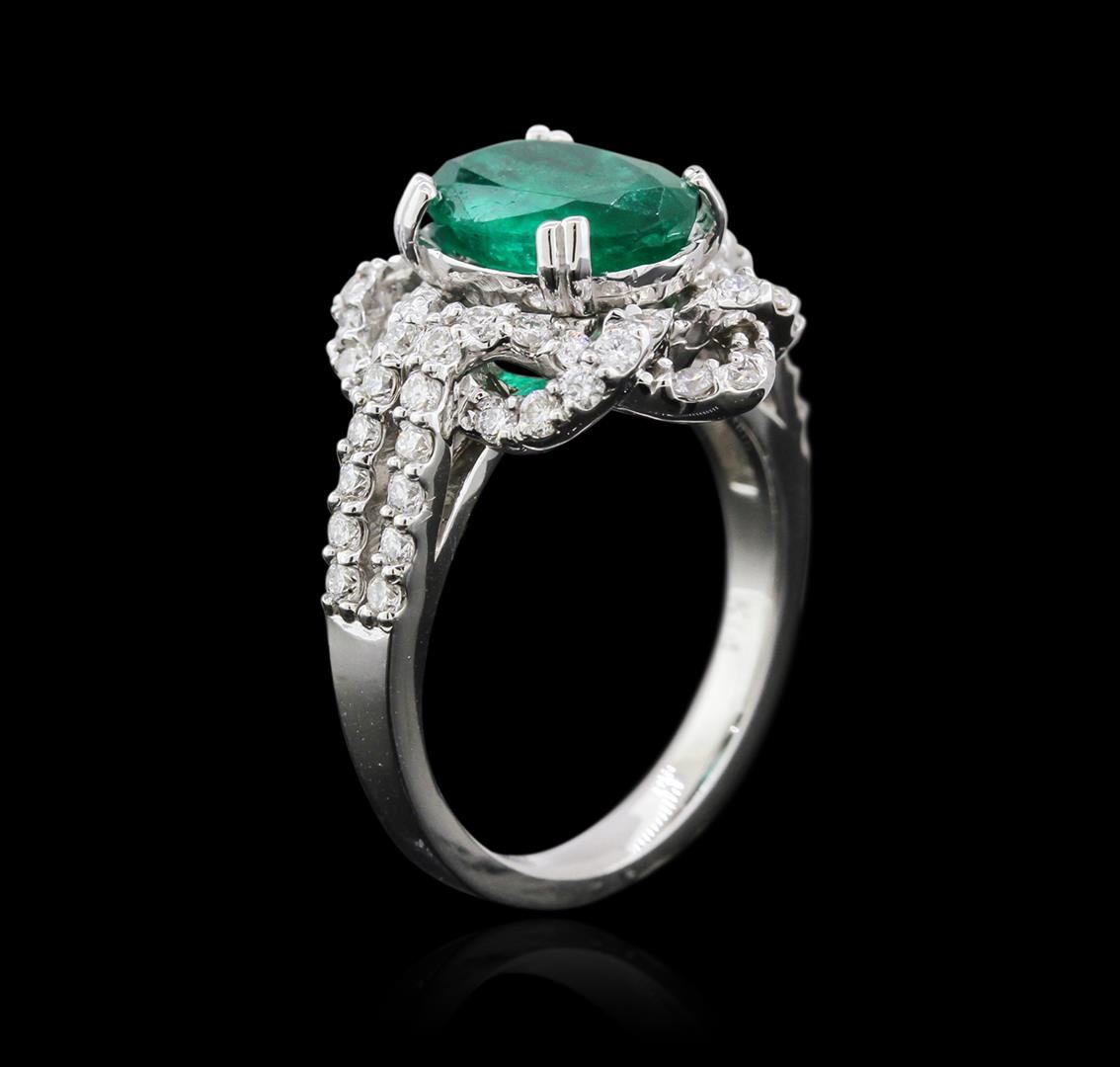 One electronically tested 14KT white gold ladies cast emerald and diamond ring with a split shoulder shank with a bright polish finish. Identified with markings of "K14". Condition is new. Containing: One prong set oval modified brilliant cut natural emerald, measuring 10.25 x 7.70 x 4.26mm, exact weight 2.30ct., clarity is heavily included, type III, medium, moderately strong, green color, (GIA G 5/4), cut is good. Sixty-Two prong set round brilliant cut diamonds, measuring 1.50 - 1.50 x 0.90mm (depth est.) exact total weight 62 Stones = 0.88ct. Clarity: SI-2 to I-2. Color: H - I, Cut is Good. All diamonds and colored gemstones are graded in the mounting, unless otherwise stated. Colored gemstones are presumed to have been subjected to commonly used enhancement processes. Total Weight of Colored Stones 2.30ct. Total Weight of Diamonds 0.88ct. Total Weight of Ring 7.10 grams. GGL Appraised at $4,155.00.