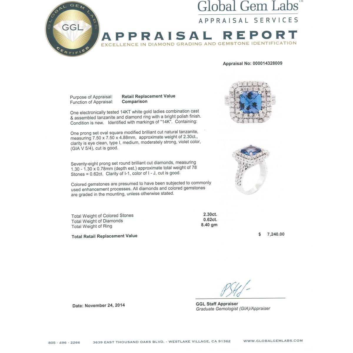 One electronically tested 14KT white gold ladies combination cast & assembled tanzanite and diamond ring with a bright polish finish. Identified with markings of "14K". Condition is new. Containing: One prong set oval square modified brilliant cut natural tanzanite, measuring 7.50 x 7.50 x 4.88mm, approximate weight of 2.30ct., clarity is eye clean, type I, medium, moderately strong, violet color, (GIA V 5/4), cut is good. Seventy-Eight prong set round brilliant cut diamonds, measuring 1.30 - 1.30 x 0.78mm (depth est.) approximate total weight of 78 Stones = 0.62ct. Clarity: I-1. Color: I - J, Cut is Good. Colored gemstones are presumed to have been subjected to commonly used enhancement processes. All diamonds and colored gemstones are graded in the mounting, unless otherwise stated. Total Weight of Colored Stones 2.30ct. Total Weight of Diamonds 0.62ct. Total Weight of Ring 8.40 grams. GGL Appraised at $7,240.00.