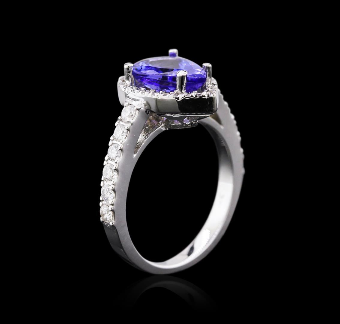 One electronically tested 14KT white gold ladies cast tanzanite and diamond ring with a bright polish finish. Identified with markings of "14K". Condition is new. Containing: One prong set pear modified brilliant cut natural tanzanite, measuring 10.50 x 7.80 x 5.07mm, approximate weight of 2.30ct., clarity is eye clean, type I, medium, moderately strong, violetish blue color, (GIA vB 5/4), cut is good. Thirty-Eight prong set round brilliant cut diamonds, measuring 2.00 - 1.30 x 0.99mm (depth est.) approximate total weight of 38 Stones = 0.60ct. Clarity: SI-2 to I-1. Color: H - I, Cut is Good. Colored gemstones are presumed to have been subjected to commonly used enhancement processes. All diamonds and colored gemstones are graded in the mounting, unless otherwise stated. Total Weight of Colored Stones 2.30ct. Total Weight of Diamonds 0.60ct. Total Weight of Ring 6.50 grams. GGL Appraised at $4,625.00.