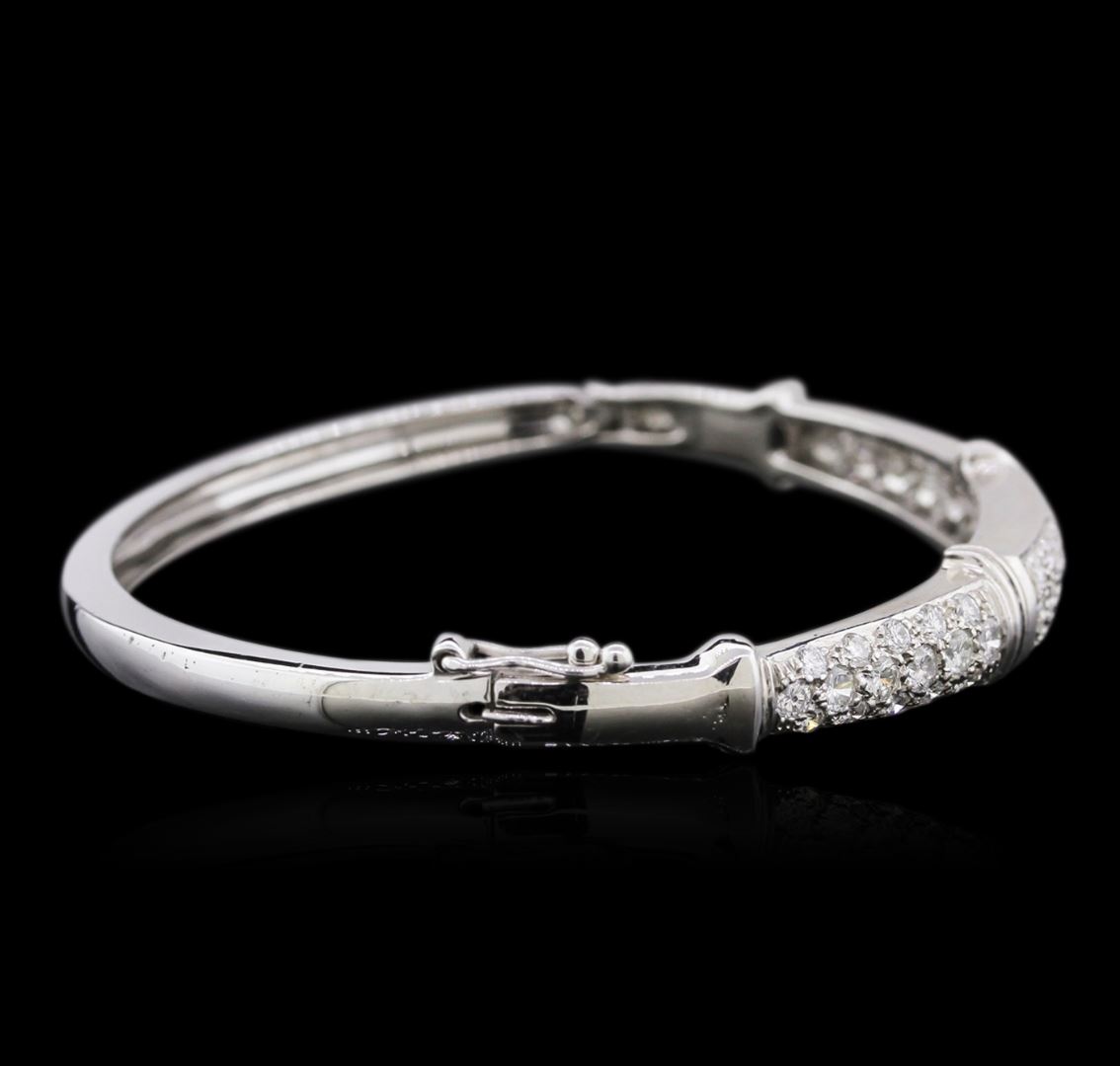 One electronically tested 14KT white gold ladies cast diamond bangle bracelet with a hidden box clasp with safety closer with a bright polish finish. Identified with markings of "14K". Condition is new. Containing: Fifty-One prong set round brilliant cut diamonds, measuring 2.50 - 1.80 x 1.29mm (depth est.) approximate total weight of 51 Stones = 2.30ct. Clarity: VS-2 to SI-1. Color: H - I, Cut is Good. Diamonds are graded in the mounting, unless otherwise stated. Total Weight of Diamonds 2.30ct. Total Weight of Bangle Bracelet 20.60 grams. GGL Appraised at $8,120.00.