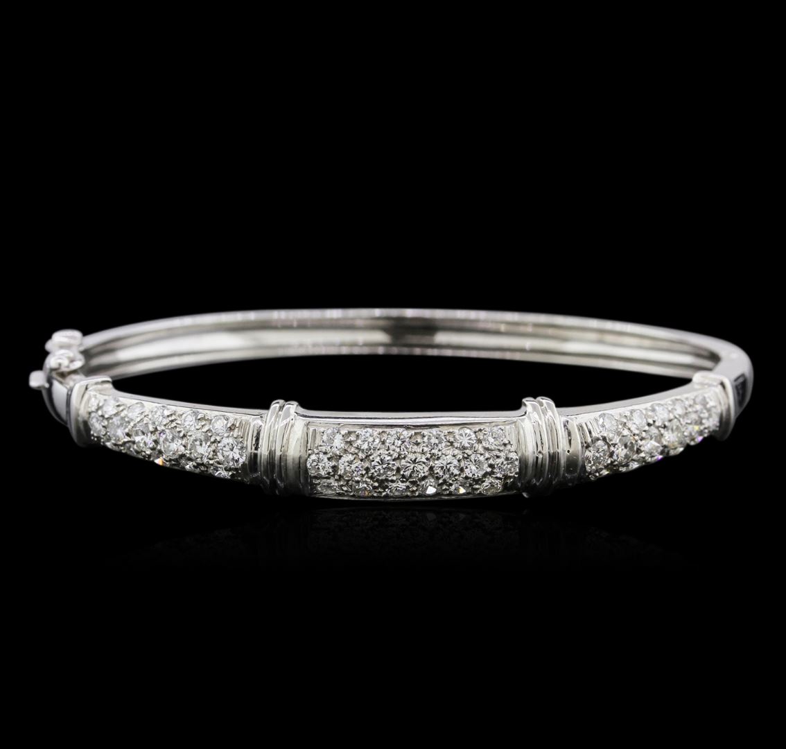 One electronically tested 14KT white gold ladies cast diamond bangle bracelet with a hidden box clasp with safety closer with a bright polish finish. Identified with markings of "14K". Condition is new. Containing: Fifty-One prong set round brilliant cut diamonds, measuring 2.50 - 1.80 x 1.29mm (depth est.) approximate total weight of 51 Stones = 2.30ct. Clarity: VS-2 to SI-1. Color: H - I, Cut is Good. Diamonds are graded in the mounting, unless otherwise stated. Total Weight of Diamonds 2.30ct. Total Weight of Bangle Bracelet 20.60 grams. GGL Appraised at $8,120.00.
