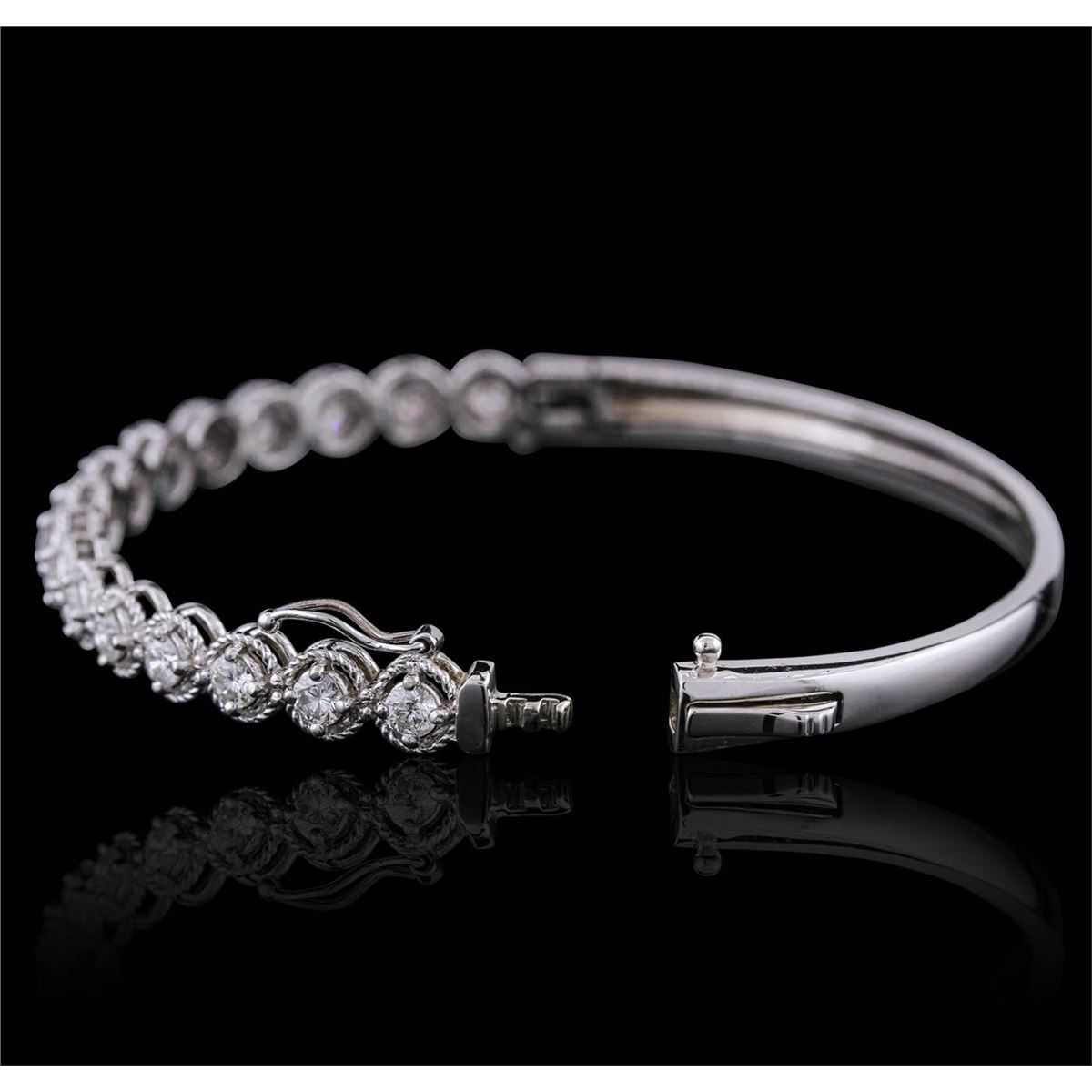 One electronically tested 14KT white gold ladies combination cast & assembled bangle bracelet with a hidden box clasp with a bright polish finish. Condition is new. Identified with markings of "14K". Containing: Sixteen prong set round brilliant cut diamonds, measuring 3.40 - 3.40 x 2.04mm (depth est.) approximate total weight of 16 Stones = 2.30ct. Clarity: SI-2 to I-1. Color: I - J, Cut is Good. All diamonds are graded in the mounting, unless otherwise stated. Total Weight of Diamonds 2.30ct. Total Weight of Bracelet 12.70 grams. GGL Appraised at $9,415.00.