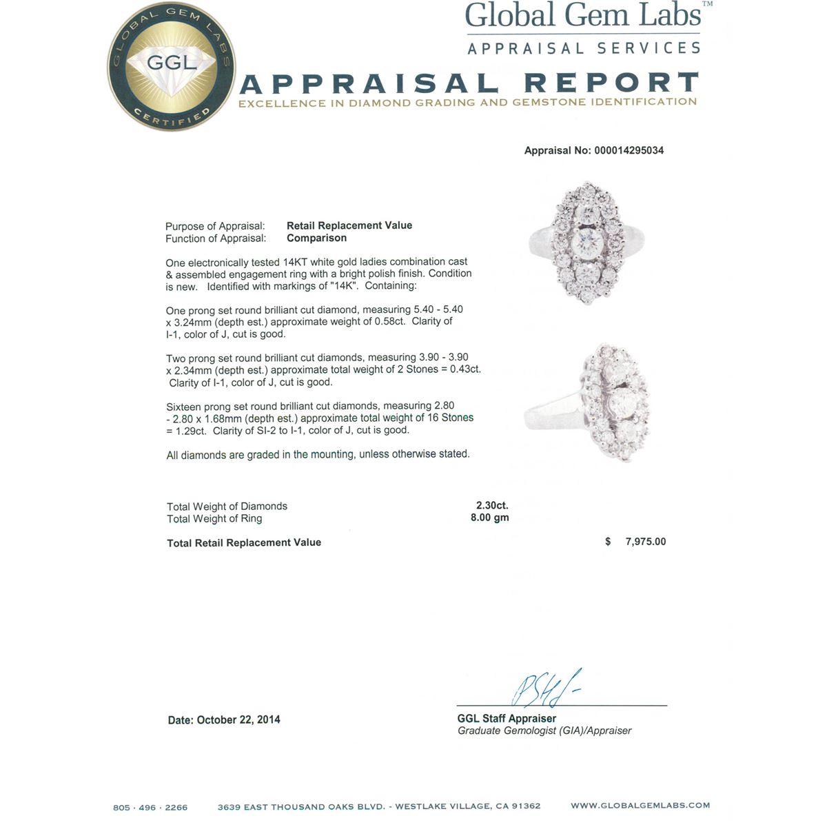 One electronically tested 14KT white gold ladies combination cast & assembled engagement ring with a bright polish finish. Identified with markings of "14K". Condition is new. Containing: One prong set round brilliant cut diamond, measuring 5.40 - 5.40 x 3.24mm (depth est.) approximate weight of 0.58ct. Clarity: I-1. Color: J, Cut is Good. Two prong set round brilliant cut diamonds, measuring 3.90 - 3.90 x 2.34mm (depth est.) approximate total weight of 2 Stones = 0.43ct. Clarity: I-1. Color: J, Cut is Good. Sixteen prong set round brilliant cut diamonds, measuring 2.80 - 2.80 x 1.68mm (depth est.) approximate total weight of 16 Stones = 1.29ct. Clarity: SI-2 to I-1. Color: J, Cut is Good. All diamonds are graded in the mounting, unless otherwise stated. Total Weight of Diamonds 2.30ct. Total Weight of Ring 8.00 grams. GGL Appraised at $7,975.00.