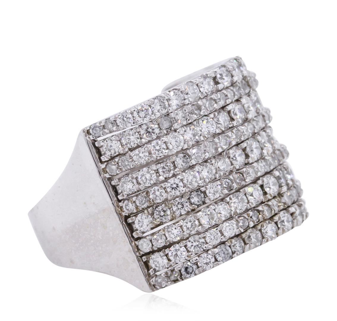 One electronically tested 14KT white gold ladies cast diamond ring with a bright polish finish. The ring features an elaborate diamond set curvature, completed by a four and one-half millimeter wide band. Identified with markings of 14K. Condition is new, good workmanship. Containing: One Hundred Seventy-Eight prong set round brilliant cut diamonds, measuring 1.80 - 1.20 x 0.90mm (depth est.) approximate total weight of 178 Stones = 2.30ct. Graded in the setting. Clarity: SI-2 to I-2. Color: G - I. Total Weight of Diamonds 2.30ct. Total Weight of Ring 12.77 grams. AIG Appraised at $8,610.00.