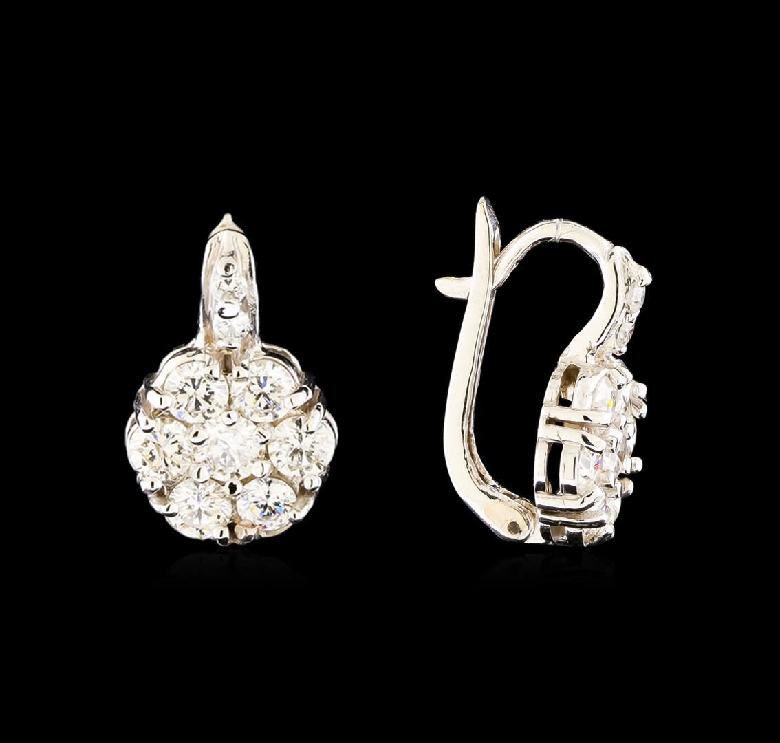 One pair electronically tested 14KT white gold ladies combination cast & assembled diamond earrings with lever backs with a bright polish finish. Identified with markings of "14K". Condition is new. Containing: Fourteen prong set round brilliant cut diamonds, measuring 3.50 - 3.50 x 2.10mm (depth est.) approximate total weight of 14 Stones = 2.20ct. Clarity: SI-1 to I-1. Color: J - K, Cut is Good. Four prong set round brilliant cut diamonds, measuring 2.00 - 2.00 x 1.20mm (depth est.) approximate total weight of 4 Stones = 0.12ct. Clarity: I-1. Color: J, Cut is Good. All diamonds are graded in the mounting, unless otherwise stated. Total Weight of Diamonds 2.31ct. Total Weight of Earrings 7.40 grams. GGL Appraised at $7,175.00.