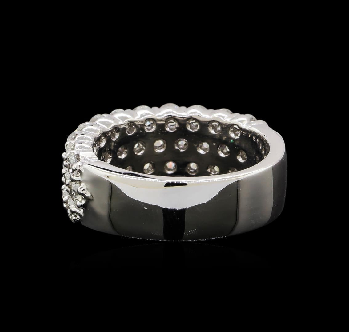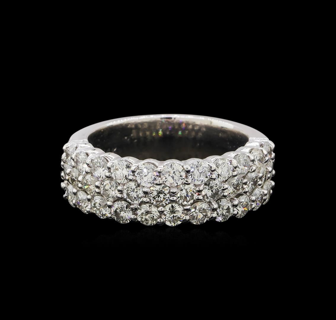 One electronically tested 14KT white gold ladies cast diamond ring with a flat shank with rounded edges with a bright polish finish. Identified with markings of "14K". Condition is new. Containing: Thirty-Four prong set round brilliant cut diamonds, measuring 2.50 - 2.50 x 1.50mm (depth est.) approximate total weight of 34 Stones = 2.31ct. Clarity: SI-1 to I-1. Color: H - J, Cut is Good. Diamonds are graded in the mounting, unless otherwise stated. Total Weight of Diamonds 2.31ct. Total Weight of Ring 9.10 grams. GGL Appraised.