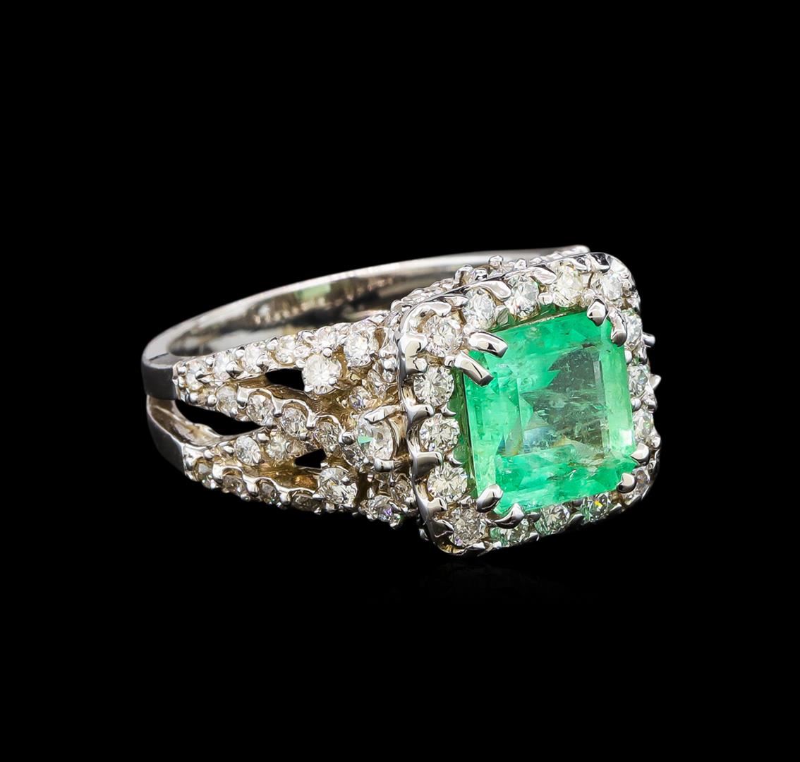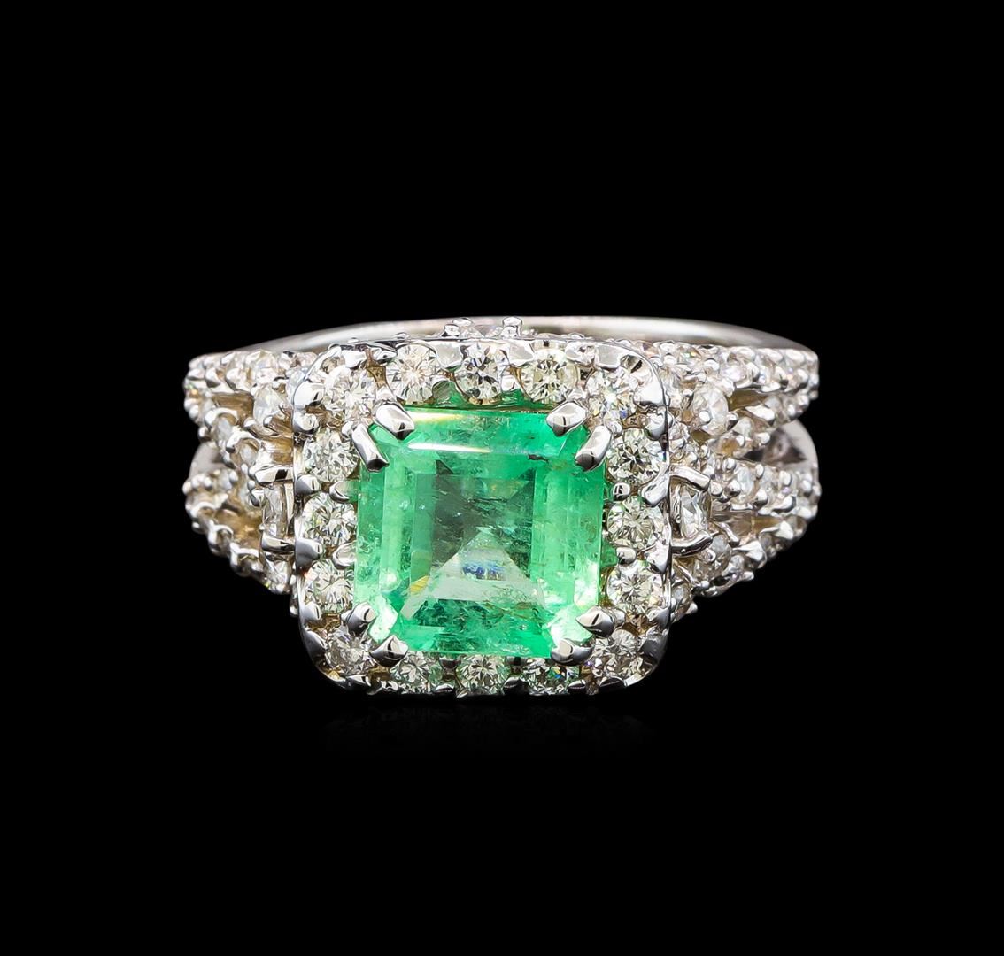 One electronically tested 14KT white gold ladies cast emerald and diamond ring with a bright polish finish. Condition is new. Containing: One prong set emerald standard step cut natural emerald, measuring 8.34 x 8.07 x 4.67mm, approximate weight of 2.31ct., clarity is moderately included, type III, light, very slightly grayish, very slightly bluish green color, (GIA vslbG 3/3), cut is good. Four prong set round brilliant cut diamonds, measuring 2.50 - 2.50 x 1.50mm (depth est.) approximate total weight of 4 Stones = 0.23ct. Clarity: SI-1 to SI-2. Color: I - J, Cut is Good. Ninety-Two prong set round brilliant cut diamonds, measuring 1.80 - 1.30 x 0.93mm (depth est.) approximate total weight of 92 Stones = 1.25ct. Clarity: SI-2 to I-2. Color: I - J, Cut is Good. Colored gemstones are presumed to have been subjected to commonly used enhancement processes. All diamonds and colored gemstones are graded in the mounting, unless otherwise stated. Total Weight of Colored Stones 2.31ct. Total Weight of Diamonds 1.48ct. Total Weight of Ring 8.20 grams. GGL Appraised at $5,760.00.