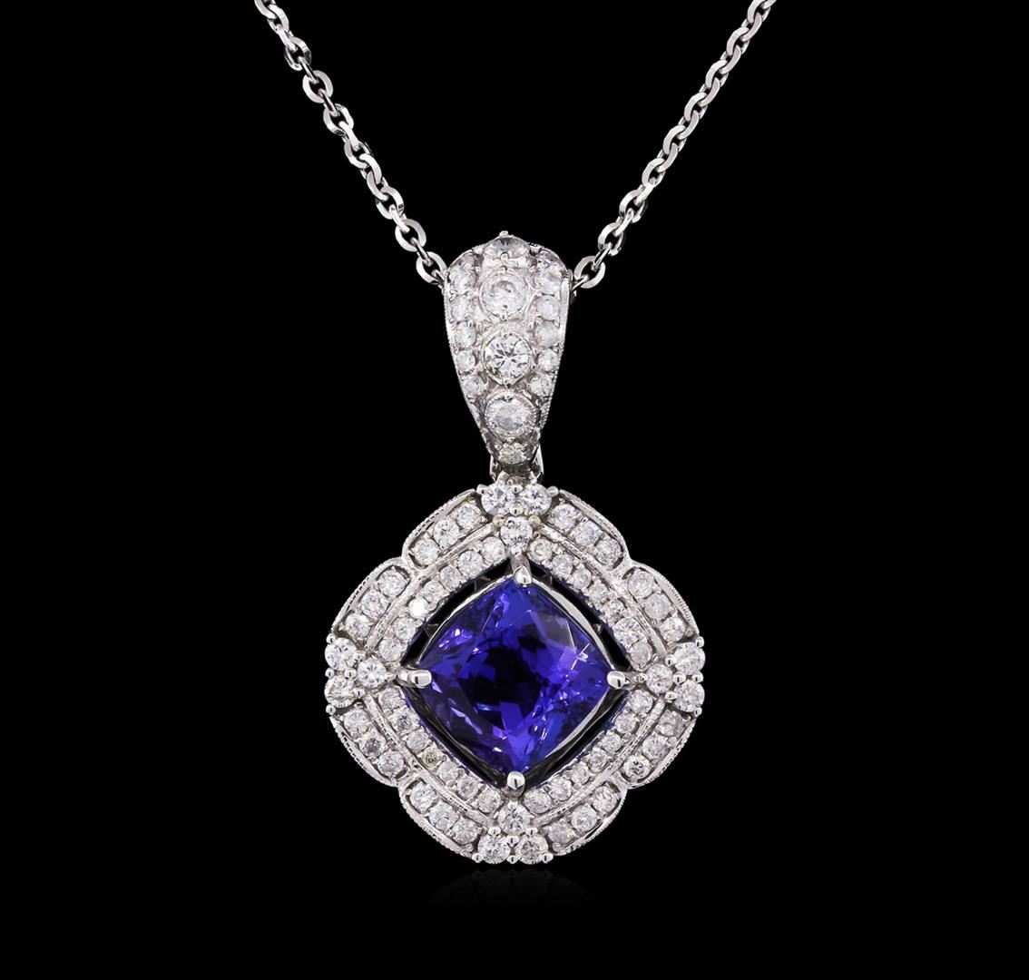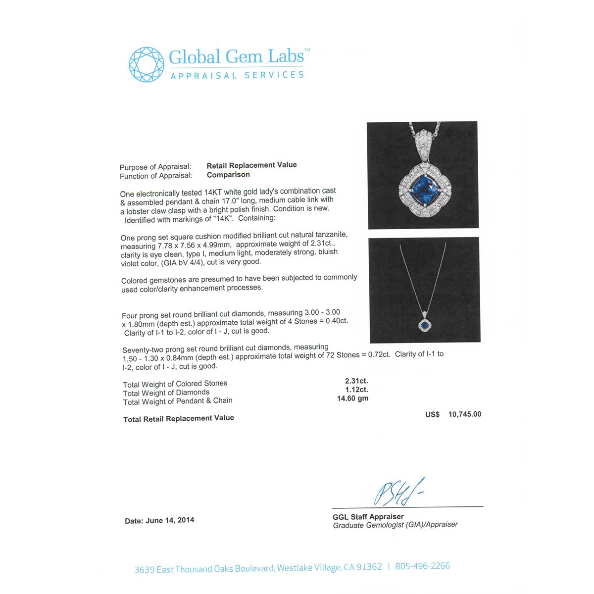 One electronically tested 14KT white gold Ladies combination cast & assembled pendant & chain 17.0" long, medium cable link with a lobster claw clasp with a bright polish finish. Condition is new. Identified with markings of "14K". Containing: One prong set square cushion modified brilliant cut natural tanzanite, measuring 7.78 x 7.56 x 4.99mm, approximate weight of 2.31ct., clarity is eye clean, type I, medium light, moderately strong, bluish violet color, (GIA bV 4/4), cut is very good. Colored gemstones are presumed to have been subjected to commonly used color/clarity enhancement processes. Four prong set round brilliant cut diamonds, measuring 3.00 - 3.00 x 1.80mm (depth est.) approximate. Total Weight of 4 Stones = 0.40ct. Clarity: I-1 to I-2. Color: I - J, Cut is Good. Seventy-Two prong set round brilliant cut diamonds, measuring 1.50 - 1.30 x 0.84mm (depth est.) approximate. Total Weight of 72 Stones = 0.72ct. Clarity: I-1 to I-2. Color: I - J, Cut is Good. Total Weight of Colored Stones 2.31ct. Total Weight of Diamonds 1.12ct. Total Weight of Pendant & Chain 14.60 grams. GGL Appraised at $10,745.00.