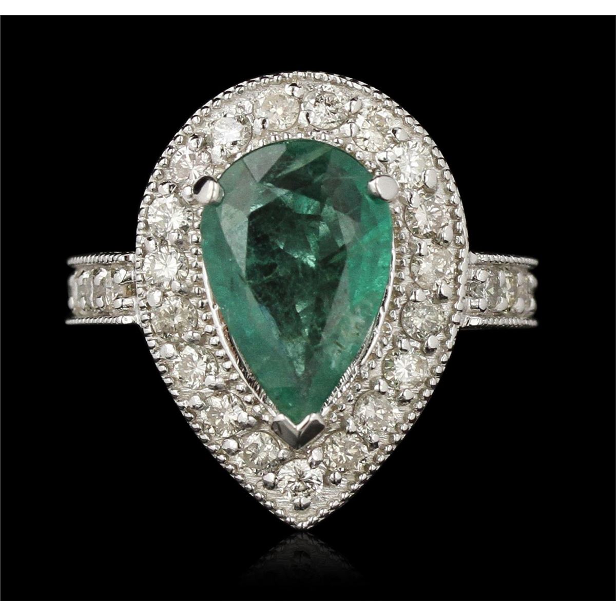 One electronically tested 14KT white gold Ladies combination cast & assembled cocktail ring with a bright polish finish. Identified with markings of "14K". Condition is excellent. Containing: One prong set pear modified brilliant cut natural emerald, measuring 13.50 x 8.50 x 3.70mm, approximate weight of 2.31ct., clarity is moderately included, type III, medium light, very slightly grayish, very slightly bluish green color, (GIA vslbG 4/3), cut is good. Colored gemstones are presumed to have been subjected to commonly used and possible undetectable color/clarity enhancement processes. Twenty-Nine prong set round brilliant cut diamonds, measuring 1.90 - 1.90 x 1.14mm (depth est.) approximate total weight of 29 Stones = 0.73ct. Clarity of SI-2 to I-1, Color of H - I, Cut is Good. Total Weight of Colored Stones 2.31ct. Total Weight of Diamonds 0.73ct. Total Weight of Ring 6.90gm. GGL Appraised at $8,450.00.