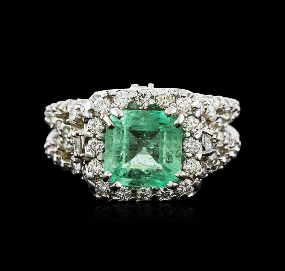 One electronically tested 14KT white gold ladies cast emerald and diamond ring with a bright polish finish. Condition is new. Containing: One prong set emerald standard step cut natural emerald, measuring 8.34 x 8.07 x 4.67mm, approximate weight of 2.31ct., clarity is moderately included, type III, light, very slightly grayish, very slightly bluish green color, (GIA vslbG 3/3), cut is good. Four prong set round brilliant cut diamonds, measuring 2.50 - 2.50 x 1.50mm (depth est.) approximate total weight of 4 Stones = 0.23ct. Clarity: SI-1 to SI-2. Color: I - J, Cut is Good. Ninety-Two prong set round brilliant cut diamonds, measuring 1.80 - 1.30 x 0.93mm (depth est.) approximate total weight of 92 Stones = 1.25ct. Clarity: SI-2 to I-2. Color: I - J, Cut is Good. Colored gemstones are presumed to have been subjected to commonly used enhancement processes. All diamonds and colored gemstones are graded in the mounting, unless otherwise stated. Total Weight of Colored Stones 2.31ct. Total Weight of Diamonds 1.48ct. Total Weight of Ring 8.20 grams. GGL Appraised at $5,760.00.