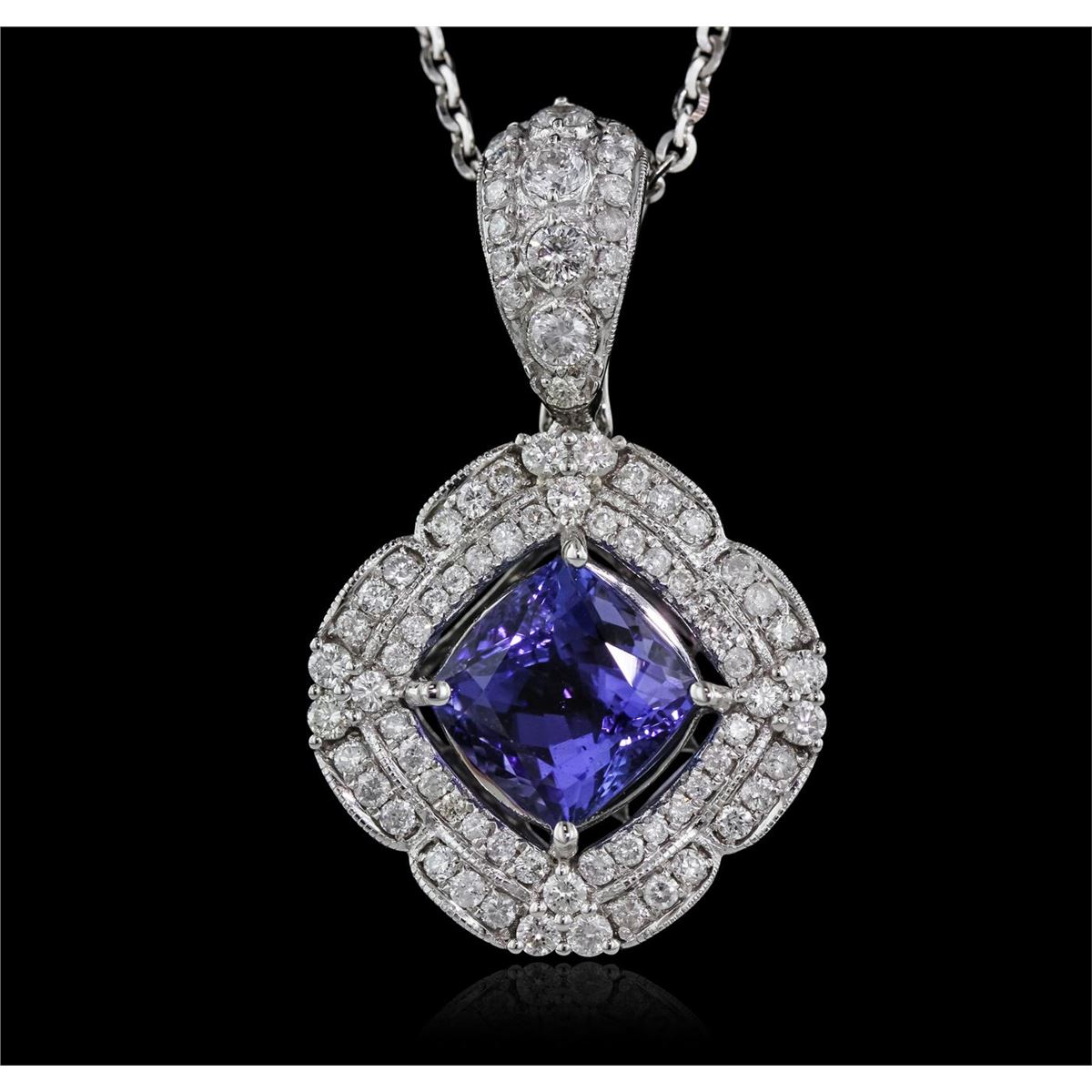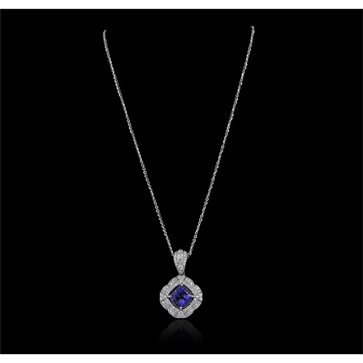 One electronically tested 14KT white gold Ladies combination cast & assembled pendant & chain 17.0" long, medium cable link with a lobster claw clasp with a bright polish finish. Condition is new. Identified with markings of "14K". Containing: One prong set square cushion modified brilliant cut natural tanzanite, measuring 7.78 x 7.56 x 4.99mm, approximate weight of 2.31ct., clarity is eye clean, type I, medium light, moderately strong, bluish violet color, (GIA bV 4/4), cut is very good. Colored gemstones are presumed to have been subjected to commonly used color/clarity enhancement processes. Four prong set round brilliant cut diamonds, measuring 3.00 - 3.00 x 1.80mm (depth est.) approximate. Total Weight of 4 Stones = 0.40ct. Clarity: I-1 to I-2. Color: I - J, Cut is Good. Seventy-Two prong set round brilliant cut diamonds, measuring 1.50 - 1.30 x 0.84mm (depth est.) approximate. Total Weight of 72 Stones = 0.72ct. Clarity: I-1 to I-2. Color: I - J, Cut is Good. Total Weight of Colored Stones 2.31ct. Total Weight of Diamonds 1.12ct. Total Weight of Pendant & Chain 14.60 grams. GGL Appraised at $10,745.00.
